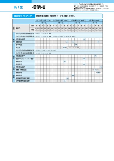 ●同一名称の講座は設置校舎・設置期間(ターム)・授業時間(時限)が異なっても同一内容です。●担当講師は変更になる場合がありますので、あらかじめご了承ください。●講師のフルネームはWebサイトでご確認ください。この色のマスが授業のある時限です。高1生●同一名称の講座は設置校舎・設置期間(ターム)・授業時間(時限)が異なっても同一内容です。●担当講師は変更になる場合がありますので、あらかじめご了承ください。●講師のフルネームはWebサイトでご確認ください。この色のマスが授業のある時限です。高1生12/15(月)~12/17(水)12/20(土)~12/24(水)12/26(金)~12/30(火)1/2(金)~1/6(火)1ターム2ターム3ターム4ターム12345612345612345612345609:00〜10:3011:00〜12:3013:20〜14:5015:20〜16:5017:20〜18:5019:20〜20:5009:00〜10:3011:00〜12:3013:20〜14:5015:20〜16:5017:20〜18:5019:20〜20:5009:00〜10:3011:00〜12:3013:20〜14:5015:20〜16:5017:20〜18:5019:20〜20:5009:00〜10:3011:00〜12:3013:20〜14:5015:20〜16:5017:20〜18:5019:20〜20:5012/25(木)17:20〜20:50伊吹12/17(水)17:20〜20:50青柳12/20(土)・12/21(日)17:20〜18:50内山(九)12/15(月)・12/16(火)17:20〜18:50隣隣12/14(日)15:20〜18:50板谷内山(九)髙橋(保)押田伊吹水野内山(九)12/22~24の3日間隣新井・園新井・清水(め)佐々木(哲)岩村塚本國分浅利杉山岡島時限時間講座名教科【ダイジェスト】冬から始める入試対策英語(特別選抜・難関)【ダイジェスト】冬から始める入試対策英語(難関・標準)特別選抜英語難関英語標準英語英文法【ダイジェスト】冬から始める入試対策数学(特別選抜・難関)【ダイジェスト】冬から始める入試対策数学(難関・標準)特別選抜数学難関数学中高一貫-アドバンスト(速習)-難関数学標準数学特別選抜国語難関・標準国語難関物理難関化学物理基礎の徹底理解化学基礎の徹底理解英語数学国語理科横浜校●2025年度/冬期講習/東日本/横浜/高1生/パターン14452025_57_3_321_31_20250714093506.csv/1ページ校了時削除