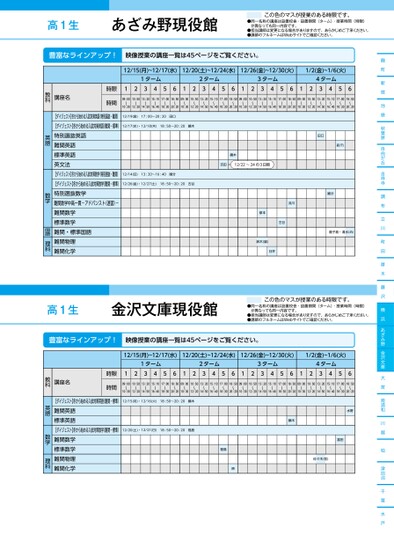●同一名称の講座は設置校舎・設置期間(ターム)・授業時間(時限)が異なっても同一内容です。●担当講師は変更になる場合がありますので、あらかじめご了承ください。●講師のフルネームはWebサイトでご確認ください。この色のマスが授業のある時限です。高1生●同一名称の講座は設置校舎・設置期間(ターム)・授業時間(時限)が異なっても同一内容です。●担当講師は変更になる場合がありますので、あらかじめご了承ください。●講師のフルネームはWebサイトでご確認ください。この色のマスが授業のある時限です。高1生あざみ野現役館麹町新宿池袋秋葉原自由が丘吉祥寺調布立川町田厚木藤沢横浜あざみ野金沢文庫大宮南浦和川越柏津田沼千葉水戸12/15(月)~12/17(水)12/20(土)~12/24(水)12/26(金)~12/30(火)1/2(金)~1/6(火)1ターム2ターム3ターム4ターム12345612345612345612345609:00〜10:3010:50〜12:2013:20〜14:5015:10〜16:4017:00〜18:3018:50〜20:2009:00〜10:3010:50〜12:2013:20〜14:5015:10〜16:4017:00〜18:3018:50〜20:2009:00〜10:3010:50〜12:2013:20〜14:5015:10〜16:4017:00〜18:3018:50〜20:2009:00〜10:3010:50〜12:2013:20〜14:5015:10〜16:4017:00〜18:3018:50〜20:2012/19(金)17:00〜20:20田口12/17(水)・12/18(木)18:50〜20:20鏑木12/14(日)13:20〜16:40國分12/27(土)12/26(金)・018:50〜20:20古谷鏑木吉田12/22~24の3日間流川塚本古谷鈴木(誠)臼井田口森(千)國分鹿子島・清水(め)時限時間講座名教科【ダイジェスト】冬から始める入試対策英語(特別選抜・難関)【ダイジェスト】冬から始める入試対策英語(難関・標準)特別選抜英語難関英語標準英語英文法【ダイジェスト】冬から始める入試対策数学(特別選抜・難関)【ダイジェスト】冬から始める入試対策数学(難関・標準)特別選抜数学難関数学中高一貫-アドバンスト(速習)-難関数学標準数学難関・標準国語難関物理難関化学英語数学国語理科金沢文庫現役館12/15(月)~12/17(水)12/20(土)~12/24(水)12/26(金)~12/30(火)1/2(金)~1/6(火)1ターム2ターム3ターム4ターム12345612345612345612345609:00〜10:3010:50〜12:2013:20〜14:5015:10〜16:4017:00〜18:3018:50〜20:2009:00〜10:3010:50〜12:2013:20〜14:5015:10〜16:4017:00〜18:3018:50〜20:2009:00〜10:3010:50〜12:2013:20〜14:5015:10〜16:4017:00〜18:3018:50〜20:2009:00〜10:3010:50〜12:2013:20〜14:5015:10〜16:4017:00〜18:3018:50〜20:20時限時間講座名12/15(月)・12/16(火)18:50〜20:20鏑木12/21(日)12/20(土)・(18:50〜20:20福島【ダイジェスト】冬から始める入試対策英語(難関・標準)難関英語標準英語【ダイジェスト】冬から始める入試対策数学(難関・標準)難関数学標準数学難関物理難関化学福島原鏑木水野富田佐々木(哲)教科英語数学理科豊富なラインアップ!映像授業の講座一覧は45ページをご覧ください。●2025年度/冬期講習/東日本/あざみ野/高1生/パターン14452025_57_3_339_31_20250717164601.csv/1ページ校了時削除