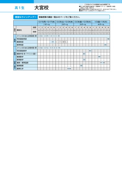 ●同一名称の講座は設置校舎・設置期間(ターム)・授業時間(時限)が異なっても同一内容です。●担当講師は変更になる場合がありますので、あらかじめご了承ください。●講師のフルネームはWebサイトでご確認ください。この色のマスが授業のある時限です。高1生●同一名称の講座は設置校舎・設置期間(ターム)・授業時間(時限)が異なっても同一内容です。●担当講師は変更になる場合がありますので、あらかじめご了承ください。●講師のフルネームはWebサイトでご確認ください。この色のマスが授業のある時限です。高1生12/15(月)~12/17(水)12/20(土)~12/24(水)12/26(金)~12/30(火)1/2(金)~1/6(火)1ターム2ターム3ターム4ターム12345612345612345612345609:00〜10:3010:50〜12:2013:20〜14:5015:10〜16:4017:00〜18:3018:50〜20:2009:00〜10:3010:50〜12:2013:20〜14:5015:10〜16:4017:00〜18:3018:50〜20:2009:00〜10:3010:50〜12:2013:20〜14:5015:10〜16:4017:00〜18:3018:50〜20:2009:00〜10:3010:50〜12:2013:20〜14:5015:10〜16:4017:00〜18:3018:50〜20:20時限時間講座名【ダイジェスト】冬から始める入試対策英語(難関・標準)特別選抜英語難関英語標準英語【ダイジェスト】冬から始める入試対策数学(難関・標準)特別選抜数学難関数学中高一貫-アドバンスト(速習)-難関数学標準数学難関・標準国語難関物理難関化学12/28(日)・12/29(月)9:00〜10:30川原川原12/17は5限のみ12/26(金)・12/27(土)18:50〜20:20河本明慶岩間口國分河本宇都秦野小林・品田向井(勇)教科英語数学国語理科大宮校●2025年度/冬期講習/東日本/大宮/高1生/パターン14452025_57_3_324_31_20250717090203.csv/1ページ校了時削除