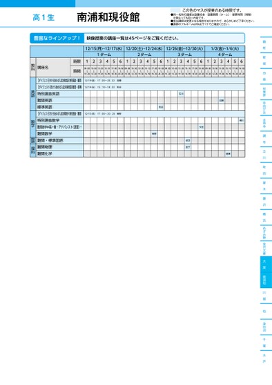 ●同一名称の講座は設置校舎・設置期間(ターム)・授業時間(時限)が異なっても同一内容です。●担当講師は変更になる場合がありますので、あらかじめご了承ください。●講師のフルネームはWebサイトでご確認ください。この色のマスが授業のある時限です。高1生●同一名称の講座は設置校舎・設置期間(ターム)・授業時間(時限)が異なっても同一内容です。●担当講師は変更になる場合がありますので、あらかじめご了承ください。●講師のフルネームはWebサイトでご確認ください。この色のマスが授業のある時限です。高1生麹町新宿池袋秋葉原自由が丘吉祥寺調布立川町田厚木藤沢横浜あざみ野金沢文庫大宮南浦和川越柏津田沼千葉水戸南浦和現役館12/15(月)~12/17(水)12/20(土)~12/24(水)12/26(金)~12/30(火)1/2(金)~1/6(火)1ターム2ターム3ターム4ターム12345612345612345612345609:00〜10:3010:50〜12:2013:20〜14:5015:10〜16:4017:00〜18:3018:50〜20:2009:00〜10:3010:50〜12:2013:20〜14:5015:10〜16:4017:00〜18:3018:50〜20:2009:00〜10:3010:50〜12:2013:20〜14:5015:10〜16:4017:00〜18:3018:50〜20:2009:00〜10:3010:50〜12:2013:20〜14:5015:10〜16:4017:00〜18:3018:50〜20:20時限時間講座名12/19(金)17:00〜20:20加藤12/14(日)15:10〜18:30秋谷12/15(月)20:2017:00〜:30秦野【ダイジェスト】冬から始める入試対策英語(特別選抜・難関)【ダイジェスト】冬から始める入試対策英語(難関・標準)特別選抜英語難関英語標準英語【ダイジェスト】冬から始める入試対策数学(特別選抜・難関)特別選抜数学難関数学中高一貫-アドバンスト(速習)-難関数学難関・標準国語難関物理難関化学石川秋谷12/15(月)18:50〜20:20秦野秦野今田品田金子加藤横川國兼教科英語数学国語理科●2025年度/冬期講習/東日本/南浦和/高1生/パターン14452025_57_3_336_31_20250717090203.csv/1ページ校了時削除