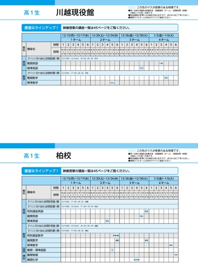 ●同一名称の講座は設置校舎・設置期間(ターム)・授業時間(時限)が異なっても同一内容です。●担当講師は変更になる場合がありますので、あらかじめご了承ください。●講師のフルネームはWebサイトでご確認ください。この色のマスが授業のある時限です。高1生●同一名称の講座は設置校舎・設置期間(ターム)・授業時間(時限)が異なっても同一内容です。●担当講師は変更になる場合がありますので、あらかじめご了承ください。●講師のフルネームはWebサイトでご確認ください。この色のマスが授業のある時限です。高1生川越現役館12/15(月)~12/17(水)12/20(土)~12/24(水)12/26(金)~12/30(火)1/2(金)~1/6(火)1ターム2ターム3ターム4ターム12345612345612345612345609:00〜10:3010:50〜12:2013:20〜14:5015:10〜16:4017:00〜18:3018:50〜20:2009:00〜10:3010:50〜12:2013:20〜14:5015:10〜16:4017:00〜18:3018:50〜20:2009:00〜10:3010:50〜12:2013:20〜14:5015:10〜16:4017:00〜18:3018:50〜20:2009:00〜10:3010:50〜12:2013:20〜14:5015:10〜16:4017:00〜18:3018:50〜20:20時限時間講座名【ダイジェスト】冬から始める入試対策英語(難関・標準)難関英語標準英語【ダイジェスト】冬から始める入試対策数学(難関・標準)難関数学標準数学12/15(月)・12/16(火)18:50〜20:20石川12/18(木)17:00〜20:20河本杉山石川川原河本教科英語数学柏校12/15(月)~12/17(水)12/20(土)~12/24(水)12/26(金)~12/30(火)1/2(金)~1/6(火)1ターム2ターム3ターム4ターム12345612345612345612345609:00〜10:3010:50〜12:2013:20〜14:5015:10〜16:4017:00〜18:3018:50〜20:2009:00〜10:3010:50〜12:2013:20〜14:5015:10〜16:4017:00〜18:3018:50〜20:2009:00〜10:3010:50〜12:2013:20〜14:5015:10〜16:4017:00〜18:3018:50〜20:2009:00〜10:3010:50〜12:2013:20〜14:5015:10〜16:4017:00〜18:3018:50〜20:20時限時間講座名12/14(日)17:00〜20:20加藤12/15(月)・12/16(火)17:00〜18:30秋谷秋12/15(月)・12/16(火)18:50〜20:20遠藤12/18(木)17:00〜20:20島田【ダイジェスト】冬から始める入試対策英語(特別選抜・難関)【ダイジェスト】冬から始める入試対策英語(難関・標準)特別選抜英語難関英語標準英語【ダイジェスト】冬から始める入試対策数学(特別選抜・難関)【ダイジェスト】冬から始める入試対策数学(難関・標準)特別選抜数学難関数学標準数学難関・標準国語難関物理難関化学秋谷伊東(鋼)遠藤中是枝高山島田鈴木(翔)成合竹中教科英語数学国語理科豊富なラインアップ!映像授業の講座一覧は45ページをご覧ください。●2025年度/冬期講習/東日本/川越/高1生/パターン14452025_57_3_333_31_20250717090203.csv/1ページ校了時削除