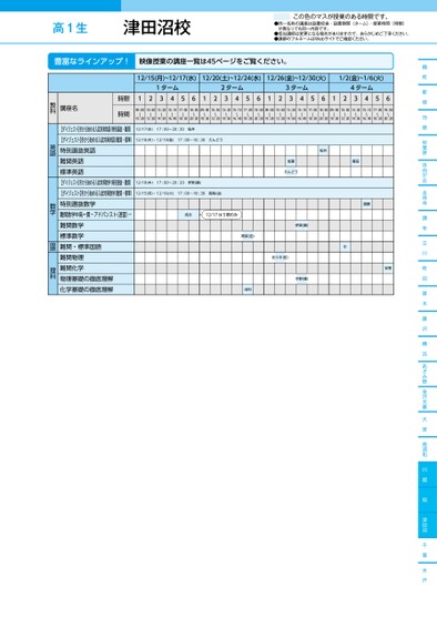 ●同一名称の講座は設置校舎・設置期間(ターム)・授業時間(時限)が異なっても同一内容です。●担当講師は変更になる場合がありますので、あらかじめご了承ください。●講師のフルネームはWebサイトでご確認ください。この色のマスが授業のある時限です。高1生●同一名称の講座は設置校舎・設置期間(ターム)・授業時間(時限)が異なっても同一内容です。●担当講師は変更になる場合がありますので、あらかじめご了承ください。●講師のフルネームはWebサイトでご確認ください。この色のマスが授業のある時限です。高1生麹町新宿池袋秋葉原自由が丘吉祥寺調布立川町田厚木藤沢横浜あざみ野金沢文庫大宮南浦和川越柏津田沼千葉水戸12/15(月)~12/17(水)12/20(土)~12/24(水)12/26(金)~12/30(火)1/2(金)~1/6(火)1ターム2ターム3ターム4ターム12345612345612345612345609:00〜10:3010:50〜12:2013:20〜14:5015:10〜16:4017:00〜18:3018:50〜20:2009:00〜10:3010:50〜12:2013:20〜14:5015:10〜16:4017:00〜18:3018:50〜20:2009:00〜10:3010:50〜12:2013:20〜14:5015:10〜16:4017:00〜18:3018:50〜20:2009:00〜10:3010:50〜12:2013:20〜14:5015:10〜16:4017:00〜18:3018:50〜20:20時限時間講座名12/17(水)17:00〜20:20桜井12/18(木)・12/19(金)17:00〜18:30えんどう12/18(木)17:00〜20:20伊東(鋼)12/16(火)12/15(月)・(17:00〜18:30高梨(由)成合12/17は5限のみ【ダイジェスト】冬から始める入試対策英語(特別選抜・難関)【ダイジェスト】冬から始める入試対策英語(難関・標準)特別選抜英語難関英語標準英語【ダイジェスト】冬から始める入試対策数学(特別選抜・難関)【ダイジェスト】冬から始める入試対策数学(難関・標準)特別選抜数学難関数学中高一貫-アドバンスト(速習)-難関数学標準数学難関・標準国語難関物理難関化学物理基礎の徹底理解化学基礎の徹底理解桜井藤田加藤えんどう遠藤中安東伊東(鋼)中野(健)佐々木(哲)高梨(由)浅利教科英語数学国語理科津田沼校●2025年度/冬期講習/東日本/津田沼/高1生/パターン14452025_57_3_327_31_20250717094046.csv/1ページ校了時削除
