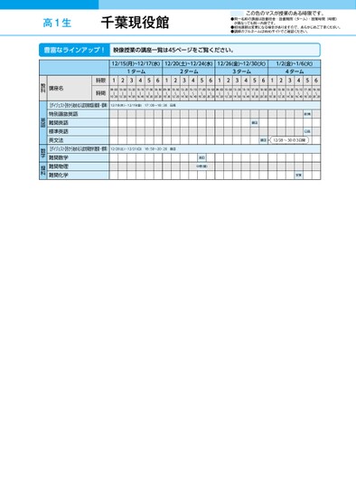 ●同一名称の講座は設置校舎・設置期間(ターム)・授業時間(時限)が異なっても同一内容です。●担当講師は変更になる場合がありますので、あらかじめご了承ください。●講師のフルネームはWebサイトでご確認ください。この色のマスが授業のある時限です。高1生●同一名称の講座は設置校舎・設置期間(ターム)・授業時間(時限)が異なっても同一内容です。●担当講師は変更になる場合がありますので、あらかじめご了承ください。●講師のフルネームはWebサイトでご確認ください。この色のマスが授業のある時限です。高1生12/15(月)~12/17(水)12/20(土)~12/24(水)12/26(金)~12/30(火)1/2(金)~1/6(火)1ターム2ターム3ターム4ターム12345612345612345612345609:00〜10:3010:50〜12:2013:20〜14:5015:10〜16:4017:00〜18:3018:50〜20:2009:00〜10:3010:50〜12:2013:20〜14:5015:10〜16:4017:00〜18:3018:50〜20:2009:00〜10:3010:50〜12:2013:20〜14:5015:10〜16:4017:00〜18:3018:50〜20:2009:00〜10:3010:50〜12:2013:20〜14:5015:10〜16:4017:00〜18:3018:50〜20:20時限時間講座名【ダイジェスト】冬から始める入試対策英語(難関・標準)特別選抜英語難関英語標準英語英文法【ダイジェスト】冬から始める入試対策数学(難関・標準)難関数学難関物理難関化学12/18(木)・12/19(金)17:00〜18:30日髙12/20(土)・12/21(日)18:50〜20:20島田島田中野(健)藤田森(博)日髙藤田12/28~30の3日間安東教科英語数学理科千葉現役館●2025年度/冬期講習/東日本/千葉/高1生/パターン14452025_57_3_334_31_20250717090203.csv/1ページ校了時削除