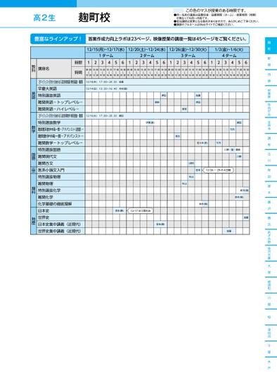 豊富なラインアップ!答案作成力向上ラボは23ページ、映像授業の講座一覧は45ページをご覧ください。麹町新宿池袋秋葉原自由が丘吉祥寺調布立川町田厚木藤沢横浜あざみ野金沢文庫大宮南浦和川越柏津田沼千葉水戸12/18(木)17:00〜20:20佐藤12/14(日)13:20〜16:40木村(智)12/16(火)17:00〜20:20郷田伊東(敦)押田青柳佐藤押田是枝成合佐々木(吾)竹内郷田竹内川野・園・豊崎川野田本12/26~29の4日間小野木杉山杉山鈴木(翔)鈴木(翔)鈴木(翔)加藤加藤坂本(勝)12/17は5限のみ坂本(勝)高2生麹町校この色のマスが授業のある時限です。●同一名称の講座は設置校舎・設置期間(ターム)・授業時間(時限)が異なっても同一内容です。●担当講師は変更になる場合がありますので、あらかじめご了承ください。●講師のフルネームはWebサイトでご確認ください。12/15(月)~12/17(水)12/20(土)~12/24(水)12/26(金)~12/30(火)1/2(金)~1/6(火)1ターム2ターム3ターム4ターム12345612345612345612345609:00〜10:3010:50〜12:2013:20〜14:5015:10〜16:4017:00〜18:3018:50〜20:2009:00〜10:3010:50〜12:2013:20〜14:5015:10〜16:4017:00〜18:3018:50〜20:2009:00〜10:3010:50〜12:2013:20〜14:5015:10〜16:4017:00〜18:3018:50〜20:2009:00〜10:3010:50〜12:2013:20〜14:5015:10〜16:4017:00〜18:3018:50〜20:20時限時間講座名【ダイジェスト】冬から始める入試対策英語(特別選抜・難関)早慶大英語特別選抜英語難関英語-トップレベル-難関英語-ハイレベル-【ダイジェスト】冬から始める入試対策数学(特別選抜・難関)特別選抜数学難関理系数学中高一貫-アドバンスト(速習)-難関数学中高一貫-アドバンスト-難関数学-トップレベル-特別選抜国語難関現代文難関古文医系小論文入門特別選抜物理難関物理特別選抜化学難関化学化学基礎の徹底理解日本史世界史日本史集中講義(近現代)世界史集中講義(近現代)教科英語数学国語小論文理科地歴●2025年度/冬期講習/東日本/麹町/高2生/パターン14452025_57_3_328_32_20250717154645.csv/1ページ校了時削除