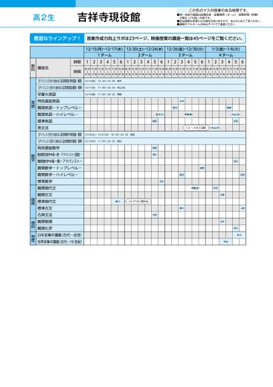 ●同一名称の講座は設置校舎・設置期間(ターム)・授業時間(時限)が異なっても同一内容です。●担当講師は変更になる場合がありますので、あらかじめご了承ください。●講師のフルネームはWebサイトでご確認ください。この色のマスが授業のある時限です。高2生12/15(月)~12/17(水)12/20(土)~12/24(水)12/26(金)~12/30(火)1/2(金)~1/6(火)1ターム2ターム3ターム4ターム12345612345612345612345609:0010:5013:2015:1017:0018:5009:0010:5013:2015:1017:0018:5009:0010:5013:2015:1017:0018:5009:0010:5013:2015:1017:0018:5010:3012:2014:5016:4018:3020:2010:3012:2014:5016:4018:3020:2010:3012:2014:5016:4018:3020:2010:3012:2014:5016:4018:3020:2012/14(日)13:20〜16:40青木12/17(水)17:00〜20:20内山(洋)12/19(金)17:00〜20:20青柳12/20(土)・12/21(日)18:50〜20:20岡田12/18(木)17:00〜20:20渡辺絵川12/17は5限のみ礒貝岡田相川中村古谷山本木青田中(久)伊藤(剛)柳青内山(洋)吉田1/2~4の3日間内山(洋)辺渡川貴流川長野伊藤(武)木村吉澤竹中田迫田上早川早川平松時限時間講座名教科【ダイジェスト】冬から始める入試対策英語(特別選抜・難関)【ダイジェスト】冬から始める入試対策英語(難関・標準)早慶大英語特別選抜英語難関英語-トップレベル-難関英語-ハイレベル-標準英語英文法【ダイジェスト】冬から始める入試対策数学(特別選抜・難関)【ダイジェスト】冬から始める入試対策数学(難関・標準)特別選抜数学難関理系数学中高一貫-アドバンスト(速習)-難関数学中高一貫-アドバンスト-難関数学-トップレベル-難関数学-ハイレベル-標準数学難関現代文難関古文標準現代文標準古文古典文法難関物理難関化学日本史集中講義(古代―近世)世界史集中講義(古代―18世紀)英語数学国語理科地歴吉祥寺現役館●2025年度/冬期講習/東日本/吉祥寺/高2生/パターン14452025_57_3_340_32_20250717154645.csv/1ページ校了時削除