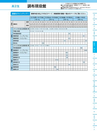 ●同一名称の講座は設置校舎・設置期間(ターム)・授業時間(時限)が異なっても同一内容です。●担当講師は変更になる場合がありますので、あらかじめご了承ください。●講師のフルネームはWebサイトでご確認ください。この色のマスが授業のある時限です。高2生麹町新宿池袋秋葉原自由が丘吉祥寺調布立川町田厚木藤沢横浜あざみ野金沢文庫大宮南浦和川越柏津田沼千葉水戸12/15(月)~12/17(水)12/20(土)~12/24(水)12/26(金)~12/30(火)1/2(金)~1/6(火)1ターム2ターム3ターム4ターム12345612345612345612345609:00〜10:3010:50〜12:2013:20〜14:5015:10〜16:4017:00〜18:3018:50〜20:2009:00〜10:3010:50〜12:2013:20〜14:5015:10〜16:4017:00〜18:3018:50〜20:2009:00〜10:3010:50〜12:2013:20〜14:5015:10〜16:4017:00〜18:3018:50〜20:2009:00〜10:3010:50〜12:2013:20〜14:5015:10〜16:4017:00〜18:3018:50〜20:2012/15(月)・12/16(火)17:00〜18:30吉田12/22(月)・12/23(火)18:50〜20:20青木12/17(水)17:00〜20:20青木青木吉田12/26(金)・12/27(土)17:00〜18:30高梨(大)村内山(洋)高梨(大)大島高梨(大)窪田川野貴川酒井(完)宇都安東青木青木岡田佐藤(健)大窪時限時間講座名教科【ダイジェスト】冬から始める入試対策英語(難関・標準)早慶大英語特別選抜英語難関英語-トップレベル-難関英語-ハイレベル-標準英語英文法【ダイジェスト】冬から始める入試対策数学(難関・標準)特別選抜数学難関数学-トップレベル-難関数学-ハイレベル-標準数学難関現代文難関古文標準現代文標準古文難関物理難関化学英語数学国語理科調布現役館●2025年度/冬期講習/東日本/調布/高2生/パターン14452025_57_3_367_32_20250717154645.csv/1ページ校了時削除