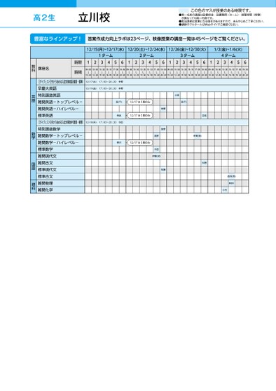 ●同一名称の講座は設置校舎・設置期間(ターム)・授業時間(時限)が異なっても同一内容です。●担当講師は変更になる場合がありますので、あらかじめご了承ください。●講師のフルネームはWebサイトでご確認ください。この色のマスが授業のある時限です。高2生12/15(月)~12/17(水)12/20(土)~12/24(水)12/26(金)~12/30(火)1/2(金)~1/6(火)1ターム2ターム3ターム4ターム12345612345612345612345609:00〜10:3010:50〜12:2013:20〜14:5015:10〜16:4017:00〜18:3018:50〜20:2009:00〜10:3010:50〜12:2013:20〜14:5015:10〜16:4017:00〜18:3018:50〜20:2009:00〜10:3010:50〜12:2013:20〜14:5015:10〜16:4017:00〜18:3018:50〜20:2009:00〜10:3010:50〜12:2013:20〜14:5015:10〜16:4017:00〜18:3018:50〜20:2012/17(水)17:00〜20:20仲野12/19(金)17:00〜20:20仲野森(千)12/17は5限のみ幸長12/17は5限のみ12/18(木)17:00〜20:20今田柳沢12/17は5限のみ小森森(千)伊東(敦)日髙大野仲野長野松藤長野今田伊藤(武)酒井(完)長谷川小竹時限時間講座名教科【ダイジェスト】冬から始める入試対策英語(難関・標準)早慶大英語特別選抜英語難関英語-トップレベル-難関英語-ハイレベル-標準英語【ダイジェスト】冬から始める入試対策数学(難関・標準)特別選抜数学難関数学-トップレベル-難関数学-ハイレベル-標準数学難関現代文難関古文標準現代文標準古文難関物理難関化学英語数学国語理科立川校●2025年度/冬期講習/東日本/立川/高2生/パターン14452025_57_3_315_32_20250717154645.csv/1ページ校了時削除
