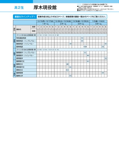 ●同一名称の講座は設置校舎・設置期間(ターム)・授業時間(時限)が異なっても同一内容です。●担当講師は変更になる場合がありますので、あらかじめご了承ください。●講師のフルネームはWebサイトでご確認ください。この色のマスが授業のある時限です。高2生12/15(月)~12/17(水)12/20(土)~12/24(水)12/26(金)~12/30(火)1/2(金)~1/6(火)1ターム2ターム3ターム4ターム12345612345612345612345609:00〜10:3010:50〜12:2013:20〜14:5015:10〜16:4017:00〜18:3018:50〜20:2009:00〜10:3010:50〜12:2013:20〜14:5015:10〜16:4017:00〜18:3018:50〜20:2009:00〜10:3010:50〜12:2013:20〜14:5015:10〜16:4017:00〜18:3018:50〜20:2009:00〜10:3010:50〜12:2013:20〜14:5015:10〜16:4017:00〜18:3018:50〜20:20時限時間講座名【ダイジェスト】冬から始める入試対策英語(難関・標準)特別選抜英語難関英語-トップレベル-難関英語-ハイレベル-標準英語【ダイジェスト】冬から始める入試対策数学(難関・標準)難関数学-トップレベル-難関数学-ハイレベル-標準数学難関現代文難関古文標準現代文標準古文難関物理難関化学12/17(水)・12/18(木)18:50〜20:20安井12/15(月)・12/16(火)18:50〜20:20川口伊吹安井水野越野清水(め)森永早川木村(麟)川口富田絵川岡本大島古谷矢野教科英語数学国語理科厚木現役館●2025年度/冬期講習/東日本/厚木/高2生/パターン14452025_57_3_332_32_20250717154645.csv/1ページ校了時削除