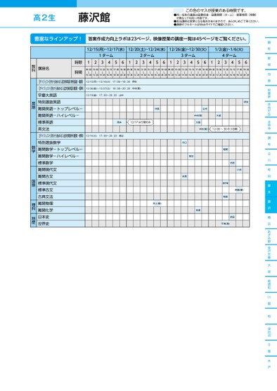 ●同一名称の講座は設置校舎・設置期間(ターム)・授業時間(時限)が異なっても同一内容です。●担当講師は変更になる場合がありますので、あらかじめご了承ください。●講師のフルネームはWebサイトでご確認ください。この色のマスが授業のある時限です。高2生麹町新宿池袋秋葉原自由が丘吉祥寺調布立川町田厚木藤沢横浜あざみ野金沢文庫大宮南浦和川越柏津田沼千葉水戸12/15(月)~12/17(水)12/20(土)~12/24(水)12/26(金)~12/30(火)1/2(金)~1/6(火)1ターム2ターム3ターム4ターム12345612345612345612345609:00〜10:3010:50〜12:2013:20〜14:5015:10〜16:4017:00〜18:3018:50〜20:2009:00〜10:3010:50〜12:2013:20〜14:5015:10〜16:4017:00〜18:3018:50〜20:2009:00〜10:3010:50〜12:2013:20〜14:5015:10〜16:4017:00〜18:3018:50〜20:2009:00〜10:3010:50〜12:2013:20〜14:5015:10〜16:4017:00〜18:3018:50〜20:2012/15(月)・12/16(火)17:00〜18:30伊吹12/26(金)・12/27(土)18:50〜20:20木村(智)木村(智)12/19(金)17:00〜20:20山中中島岡本12/17は5限のみ12/16(火)17:00〜20:20板谷伊吹山中木村(智)大島大胡木村(智)12/28~30の3日間板谷川口吉澤井上(順)安達堀尾鹿子島税田合田小池阿部(順)依田平尾(雅)時限時間講座名教科【ダイジェスト】冬から始める入試対策英語(特別選抜・難関)【ダイジェスト】冬から始める入試対策英語(難関・標準)早慶大英語特別選抜英語難関英語-トップレベル-難関英語-ハイレベル-標準英語英文法【ダイジェスト】冬から始める入試対策数学(難関・標準)特別選抜数学難関数学-トップレベル-難関数学-ハイレベル-標準数学難関現代文難関古文標準現代文標準古文古典文法難関物理難関化学日本史世界史英語数学国語理科地歴藤沢館●2025年度/冬期講習/東日本/藤沢/高2生/パターン14452025_57_3_331_32_20250717091845.csv/1ページ校了時削除