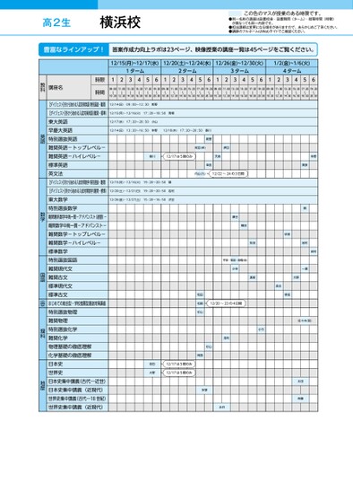 ●同一名称の講座は設置校舎・設置期間(ターム)・授業時間(時限)が異なっても同一内容です。●担当講師は変更になる場合がありますので、あらかじめご了承ください。●講師のフルネームはWebサイトでご確認ください。この色のマスが授業のある時限です。高2生12/15(月)~12/17(水)12/20(土)~12/24(水)12/26(金)~12/30(火)1/2(金)~1/6(火)1ターム2ターム3ターム4ターム12345612345612345612345609:00〜10:3011:00〜12:3013:20〜14:5015:20〜16:5017:20〜18:5019:20〜20:5009:00〜10:3011:00〜12:3013:20〜14:5015:20〜16:5017:20〜18:5019:20〜20:5009:00〜10:3011:00〜12:3013:20〜14:5015:20〜16:5017:20〜18:5019:20〜20:5009:00〜10:3011:00〜12:3013:20〜14:5015:20〜16:5017:20〜18:5019:20〜20:5012/14(日)09:00〜12:30新野12/15(月)・12/16(火)17:20〜18:50青柳12/17(水)17:20〜20:50小山12/14(日)13:20〜16:50仲野12/18(木)17:20〜20:50香川新野柴田(卓)押田香川12/17は5限のみ天倉幸長内山(九)12/22~24の3日間12/15(月)・12/16(火)19:20〜20:50隣12/20(土)・12/21(日)19:20〜20:50岩村12/26(金)・12/27(土)15:20〜16:50渋谷瀬谷横田手塚・税田・髙橋(佳)小林和田松崎杉山12/20~23の4日間浅利杉山岡島安部永井依田大野12/17は5限のみ12/17は5限のみ仲野栗原隣岩村一瀬岩村依田生田渡部大野森永隼坂佐々木(哲)小竹太田斉藤時限時間講座名教科【ダイジェスト】冬から始める入試対策英語(特別選抜・難関)【ダイジェスト】冬から始める入試対策英語(難関・標準)東大英語早慶大英語特別選抜英語難関英語-トップレベル-難関英語-ハイレベル-標準英語英文法【ダイジェスト】冬から始める入試対策数学(特別選抜・難関)【ダイジェスト】冬から始める入試対策数学(難関・標準)東大数学特別選抜数学難関理系数学中高一貫-アドバンスト(速習)-難関数学中高一貫-アドバンスト-難関数学-トップレベル-難関数学-ハイレベル-標準数学特別選抜国語難関現代文難関古文標準現代文標準古文はじめての総合型・学校推薦型選抜対策講座特別選抜物理難関物理特別選抜化学難関化学物理基礎の徹底理解化学基礎の徹底理解日本史世界史日本史集中講義(古代―近世)日本史集中講義(近現代)世界史集中講義(古代―18世紀)世界史集中講義(近現代)英語数学国語小論文理科地歴横浜校●2025年度/冬期講習/東日本/横浜/高2生/パターン14452025_57_3_321_32_20250717154645.csv/1ページ校了時削除
