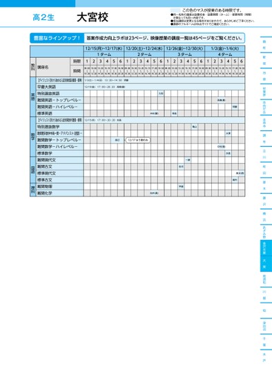 ●同一名称の講座は設置校舎・設置期間(ターム)・授業時間(時限)が異なっても同一内容です。●担当講師は変更になる場合がありますので、あらかじめご了承ください。●講師のフルネームはWebサイトでご確認ください。この色のマスが授業のある時限です。高2生麹町新宿池袋秋葉原自由が丘吉祥寺調布立川町田厚木藤沢横浜あざみ野金沢文庫大宮南浦和川越柏津田沼千葉水戸12/15(月)~12/17(水)12/20(土)~12/24(水)12/26(金)~12/30(火)1/2(金)~1/6(火)1ターム2ターム3ターム4ターム12345612345612345612345609:00〜10:3010:50〜12:2013:20〜14:5015:10〜16:4017:00〜18:3018:50〜20:2009:00〜10:3010:50〜12:2013:20〜14:5015:10〜16:4017:00〜18:3018:50〜20:2009:00〜10:3010:50〜12:2013:20〜14:5015:10〜16:4017:00〜18:3018:50〜20:2009:00〜10:3010:50〜12:2013:20〜14:5015:10〜16:4017:00〜18:3018:50〜20:201/3(土)・1/4(日)13:20〜14:50明慶12/19(金)17:00〜20:20髙橋(慶)久恒木村(麟)幸長12/15(月)20:2017:00〜:30永島12/15(月)18:50〜20:20永島渡辺12/17は5限のみ亀山一瀬佐河宇都向井(勇)髙橋(慶)明慶大澤永島中村(隆)清水(直)鹿内時限時間講座名教科【ダイジェスト】冬から始める入試対策英語(難関・標準)早慶大英語特別選抜英語難関英語-トップレベル-難関英語-ハイレベル-標準英語【ダイジェスト】冬から始める入試対策数学(難関・標準)特別選抜数学難関理系数学中高一貫-アドバンスト(速習)-難関数学-トップレベル-難関数学-ハイレベル-標準数学難関現代文難関古文標準現代文標準古文難関物理難関化学英語数学国語理科大宮校●2025年度/冬期講習/東日本/大宮/高2生/パターン14452025_57_3_324_32_20250717172328.csv/1ページ校了時削除