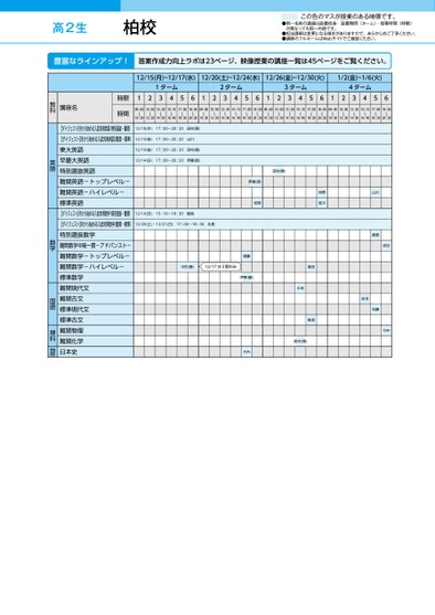 ●同一名称の講座は設置校舎・設置期間(ターム)・授業時間(時限)が異なっても同一内容です。●担当講師は変更になる場合がありますので、あらかじめご了承ください。●講師のフルネームはWebサイトでご確認ください。この色のマスが授業のある時限です。高2生12/15(月)~12/17(水)12/20(土)~12/24(水)12/26(金)~12/30(火)1/2(金)~1/6(火)1ターム2ターム3ターム4ターム12345612345612345612345609:00〜10:3010:50〜12:2013:20〜14:5015:10〜16:4017:00〜18:3018:50〜20:2009:00〜10:3010:50〜12:2013:20〜14:5015:10〜16:4017:00〜18:3018:50〜20:2009:00〜10:3010:50〜12:2013:20〜14:5015:10〜16:4017:00〜18:3018:50〜20:2009:00〜10:3010:50〜12:2013:20〜14:5015:10〜16:4017:00〜18:3018:50〜20:2012/18(木)17:00〜20:20田村(喜)12/19(金)17:00〜20:20山川12/19(金)17:00〜20:20田村(喜)12/14(日)17:00〜20:20伊藤(直)12/14(日)15:10〜18:30飯島12/20(土)・12/21(日)17:00〜18:30永島中村(隆)12/17は5限のみ田村(喜)伊藤(直)岩間仲野成川遠藤伊東(鋼)大内小池島田隼坂鈴木(翔)山川飯島成合佐河松藤竹中時限時間講座名教科【ダイジェスト】冬から始める入試対策英語(特別選抜・難関)【ダイジェスト】冬から始める入試対策英語(難関・標準)東大英語早慶大英語特別選抜英語難関英語-トップレベル-難関英語-ハイレベル-標準英語【ダイジェスト】冬から始める入試対策数学(特別選抜・難関)【ダイジェスト】冬から始める入試対策数学(難関・標準)特別選抜数学難関数学中高一貫-アドバンスト-難関数学-トップレベル-難関数学-ハイレベル-標準数学難関現代文難関古文標準現代文標準古文難関物理難関化学日本史英語数学国語理科地歴柏校●2025年度/冬期講習/東日本/柏/高2生/パターン14452025_57_3_322_32_20250717154645.csv/1ページ校了時削除