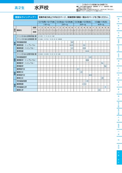 ●同一名称の講座は設置校舎・設置期間(ターム)・授業時間(時限)が異なっても同一内容です。●担当講師は変更になる場合がありますので、あらかじめご了承ください。●講師のフルネームはWebサイトでご確認ください。この色のマスが授業のある時限です。高2生麹町新宿池袋秋葉原自由が丘吉祥寺調布立川町田厚木藤沢横浜あざみ野金沢文庫大宮南浦和川越柏津田沼千葉水戸12/15(月)~12/17(水)12/20(土)~12/24(水)12/26(金)~12/30(火)1/2(金)~1/6(火)1ターム2ターム3ターム4ターム12345612345612345612345609:15〜10:4511:05〜12:3513:30〜15:0015:20〜16:5017:10〜18:4019:00〜20:3009:15〜10:4511:05〜12:3513:30〜15:0015:20〜16:5017:10〜18:4019:00〜20:3009:15〜10:4511:05〜12:3513:30〜15:0015:20〜16:5017:10〜18:4019:00〜20:3009:15〜10:4511:05〜12:3513:30〜15:0015:20〜16:5017:10〜18:4019:00〜20:3012/15(月)17:10〜20:30桜井12/27(土)12/26(金)・1()19:00〜20:30田村(修)12/28(日)・12/29(月)22金1()15:20〜16:50合田桜井池田(準)山川岡本田村(修)田村(修)合田佐藤(健)森下上田喜久里小野佐々木(哲)亀山亀山小野原白石時限時間講座名教科【ダイジェスト】冬から始める入試対策英語(特別選抜・難関)【ダイジェスト】冬から始める入試対策英語(難関・標準)特別選抜英語難関英語-トップレベル-難関英語-ハイレベル-標準英語【ダイジェスト】冬から始める入試対策数学(特別選抜・難関)特別選抜数学難関数学-トップレベル-難関数学-ハイレベル-標準数学難関現代文難関古文標準現代文標準古文特別選抜物理難関物理特別選抜化学難関化学英語数学国語理科水戸校●2025年度/冬期講習/東日本/水戸/高2生/パターン14452025_57_3_344_32_20250717154645.csv/1ページ校了時削除