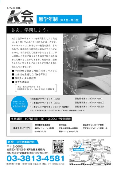 無学年制(中1生〜高3生)さあ、学問しよう。K会は数学やサイエンスを学問としてより高度に、より深く学ぶことを目的としたコースです。カリキュラムはこれまでの一般的な課程にとらわれず、体系的かつ効率的に組み立てられているので、本質が正しく理解できるとともに、早い時期から大学で扱うような高度で魅力的な内容にも触れることができます。知的刺激に溢れたK会のオリジナルプログラムで学問の世界を楽しんでみませんか。■学問全域を意識した独自のカリキュラム■主体性を重視した「無学年制」■徹底した少人数授業■優秀な講師陣東大・東大大学院の在・卒生国際科学オリンピックのメダリストも多数在籍各種オリンピック・コンテストにおけるK会生の実績・国際数学オリンピック(IMO)・日本数学オリンピック(JMO)・日本ジュニア数学オリンピック(JJMO)ほか、さまざまな大会・コンテストにおいて輝かしい成績を残しています。・国際情報オリンピック(IOI)・国際物理オリンピック(IPhO)・国際地理オリンピック(IGEO)冬期講習10月21日(火)13:00より受付開始〈講座ラインアップ〉・現代数学基礎演習・数学オリンピック対策・LaTeX入門・方程式論・代数的整数論への招待・量子コンピュータ入門・言語学オリンピック対策・天文学オリンピック対策他河合塾本郷校内K会〒112-0002文京区小石川2-6-1河合塾本郷校内詳細はこちら▶お問い合わせは下記電話番号にて受け付けしております。03-3813-4581【受付時間】13:00〜19:00※日曜・月曜はお休み(講習会・イベント実施日は受付可能)