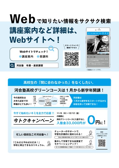 で知りたい情報をサクサク検索Web講座案内など詳細は、Webサイトへ!Webサイトでチェック!●講座案内●受講料河合塾冬期・直前講習スマートフォンで簡単アクセス冬期・直前講習(高校生・高卒生)ログインお気に入りカート高1・2生対象>講習のポイントはこちら高校生・高卒生第一志望大学合格をめざす高校生・高卒生のための短期集中講座入試を知り尽くした河合塾の講師による熱意あふれる対面授業で、短期間で効率よく学力をアップ。この冬、河合樹で確実に学力を伸ばしましょう。※画面はイメージです。高校生の「間に合わなかった」をなくしたい。河合塾高校グリーンコースは1月から新学年開講!今の高校生は大学入試までの準備がとても多い!・部活・予習・復習・テスト・行事…間に合うのかな〜学校生活入試準備・共通テスト対策・私大対策・二次試験対策・検定試験・受験校選び…河合塾は1月から新学年をスタートするから余裕を持って対策できる!今すぐ始めたいキミを全力で応援!!今トクキャンペーン11/6(木)〜12/12(金)の期間に高校グリーンコースに入塾すると、入塾金33,000円が0円に!忙しい高校生こそ河合塾へ!「これさえやれば大丈夫!」学校と両立できるカリキュラム。チューターのサポートで、学習を計画的に進められる!早めに学習計画の見通しがついて迷うことなく進められた!集中して学習できる自習室でモチベーションアップ!早くから学習習慣が確立して受験モードへの切り替えもスムーズにできた!高校グリーンコースのご案内はこちら▶