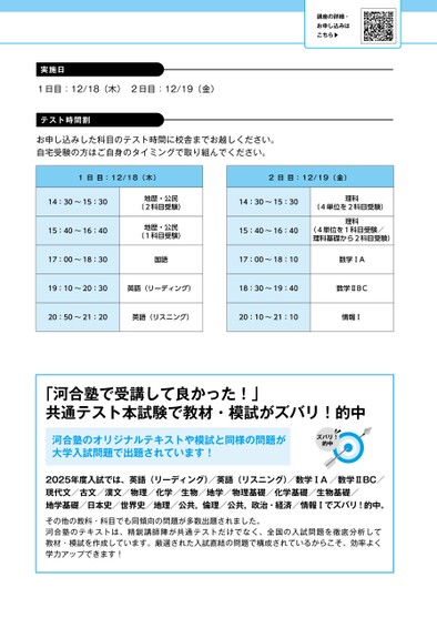 講座の詳細・お申し込みはこちら▶実施日1日目:12/18(木)2日目:12/19(金)テスト時間割お申し込みした科目のテスト時間に校舎までお越しください。自宅受験の方はご自身のタイミングで取り組んでください。1日目:12/18(木)2日目:12/19(金)14:30〜15:3015:40〜16:40地歴・公民(2科目受験)地歴・公民(1科目受験)14:30〜15:30理科(4単位を2科目受験)15:40〜16:40理科(4単位を1科目受験/理科基礎から2科目受験)17:00〜18:30国語17:00〜18:10数学ⅠA19:10〜20:30英語(リーディング)18:30〜19:40数学ⅡBC20:50〜21:20英語(リスニング)20:10〜21:10情報Ⅰ「河合塾で受講して良かった!」共通テスト本試験で教材・模試がズバリ!的中河合塾のオリジナルテキストや模試と同様の問題が大学入試問題で出題されています!ズバリ!的中2025年度入試では、英語(リーディング)/英語(リスニング)/数学ⅠA/数学ⅡBC/現代文/古文/漢文/物理/化学/生物/地学/物理基礎/化学基礎/生物基礎/地学基礎/日本史/世界史/地理/公共,倫理/公共,政治・経済/情報Ⅰでズバリ!的中。その他の教科・科目でも同傾向の問題が多数出題されました。河合塾のテキストは、精鋭講師陣が共通テストだけでなく、全国の入試問題を徹底分析して教材・模試を作成しています。厳選された入試直結の問題で構成されているからこそ、効率よく学力アップできます!