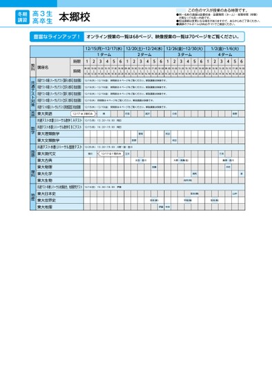 冬期講習高3生高卒生本郷校この色のマスが授業のある時限です。●同一名称の講座は設置校舎・設置期間(ターム)・授業時間(時限)が異なっても同一内容です。●担当講師は変更になる場合がありますので、あらかじめご了承ください。●講師のフルネームはWebサイトでご確認ください。12/15(月)~12/17(水)12/20(土)~12/24(水)12/26(金)~12/30(火)1/2(金)~1/6(火)1ターム2ターム3ターム4ターム12345612345612345612345609:00〜10:3010:50〜12:2013:20〜14:5015:10〜16:4017:00〜18:3018:50〜20:2009:00〜10:3010:50〜12:2013:20〜14:5015:10〜16:4017:00〜18:3018:50〜20:2009:00〜10:3010:50〜12:2013:20〜14:5015:10〜16:4017:00〜18:3018:50〜20:2009:00〜10:3010:50〜12:2013:20〜14:5015:10〜16:4017:00〜18:3018:50〜20:20時限時間講座名12/20(土)・12/21(日)時間割は3ページをご覧ください。解説講義は映像です。4ページ覧くだ。解説は映像。12/20(土)・12/21(日)時間割は3ページをご覧ください。解説講義は映像です。4ページ覧くだ。解説は映像。12/20(土)・12/21(日)時間割は3ページをご覧ください。解説講義は映像です。4ページ覧くだ。解説は映像。12/20(土)時間割は3ページをご覧ください。解説講義は映像です。4ペをご覧さい。講義はです。12/18(木)・12/19(金)時間割は4ページをご覧ください。解説講義は映像です。3ページ覧くだ。解説は映像。12/17は3限のみ墺丹羽高沢久恒新野12/15(月)13:20〜16:00岡田12/15(月)16:20〜19:00岡田香坂刈谷長野刈谷12/25(木)13:20〜19:00川野・園・西川菊川12/17は1限のみ立川太田・西川大野・髙橋(佳)加藤浅利向井(亮)12/14(日)15:30〜18:00伊藤三河藤澤・西川木村金坂本(勝)山中坂本(新)平尾(雅)坂本(新)伊藤中井共通テスト本番リハーサルテスト【理系6教科】校舎受験)共通テスト本番リハーサルテスト【文系6教科】校舎受験)共通テスト本番リハーサルテスト【理系3教科】校舎受験)共通テスト本番リハーサルテスト【文系3教科】校舎受験)共通テスト本番リハーサルテスト【英数国型】校舎受験)東大英語共通テスト本番リハーサル数学ⅠAテスト共通テスト本番リハーサル数学ⅡBCテスト東大理類数学東大文類数学共通テスト本番リハーサル国語テスト東大現代文東大古典東大物理東大化学東大生物共通テスト本番リハーサル地理総合,地理探究テスト東大日本史東大世界史東大地理教科共通テスト対策英語数学国語理科地歴●2025年度/冬期講習/東日本/本郷校/高3・卒生/パターン14452025_57_3_317_11_20250717091906.csv/1ページ校了時削除
