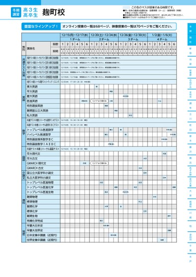 本郷麹町新宿池袋秋葉原自由が丘吉祥寺調布立川町田厚木藤沢横浜あざみ野金沢文庫大宮南浦和川越柏津田沼千葉水戸12/15(月)~12/17(水)12/20(土)~12/24(水)12/26(金)~12/30(火)1/2(金)~1/6(火)1ターム2ターム3ターム4ターム12345612345612345612345609:00〜10:3010:50〜12:2013:20〜14:5015:10〜16:4017:00〜18:3018:50〜20:2009:00〜10:3010:50〜12:2013:20〜14:5015:10〜16:4017:00〜18:3018:50〜20:2009:00〜10:3010:50〜12:2013:20〜14:5015:10〜16:4017:00〜18:3018:50〜20:2009:00〜10:3010:50〜12:2013:20〜14:5015:10〜16:4017:00〜18:3018:50〜20:20時限時間講座名共通テスト本番リハーサルテスト【理系6教科】校舎受験)共通テスト本番リハーサルテスト【文系6教科】校舎受験)共通テスト本番リハーサルテスト【理系3教科】校舎受験)共通テスト本番リハーサルテスト【文系3教科】校舎受験)共通テスト本番リハーサルテスト【英数国型】校舎受験)共通テスト本番リハーサル英語テスト(リーディング・リスニング)東大英語早大英語慶大英語医進英語特別選抜英語難関国公立大英語私大英語共通テスト本番リハーサル数学ⅠAテスト共通テスト本番リハーサル数学ⅡBCテストトップレベル医進数学ハイレベル医進数学特別選抜理系数学ⅢC特別選抜数学ⅠAⅡBC共通テスト本番リハーサル国語テスト早大現代文早大古文GMARCH現代文GMARCH古文国公立大医学科小論文私立大医学科小論文トップレベル医進物理トップレベル医進化学トップレベル医進生物難関物理標準物理難関化学標準化学難関生物有機化学完成早慶大日本史早慶大世界史日本史集中講義(近現代)世界史集中講義(近現代)12/20(土)・12/21(日)時間割は3ページをご覧ください。解説講義は映像です。4ページ覧くだ。解説は映像。12/20(土)・12/21(日)時間割は3ページをご覧ください。解説講義は映像です。4ページ覧くだ。解説は映像。12/20(土)・12/21(日)時間割は3ページをご覧ください。解説講義は映像です。4ページ覧くだ。解説は映像。12/20(土)時間割は3ページをご覧ください。解説講義は映像です。4ペをご覧さい。講義はです。12/18(木)・12/19(金)時間割は4ページをご覧ください。解説講義は映像です。3ページ覧くだ。解説は映像。12/25(木)17:00〜20:30木村(智)墺奥脇木村(智)髙橋(保)12/17は5限のみ小森小山青柳奥脇秋谷口隣口隣伊東(敦)12/15(月)15:20〜18:00郷田12/15(月)18:20〜21:00郷田12/16(火)15:10〜20:50税田兵頭12/17は5限のみ合田樹葉寺田長井向井(亮)大澤金菊川坂本(勝)坂本(勝)太田合田杉山太田田本臼井中村(敬)中村(敬)中村(敬)兵頭田本樹葉木村唐牛加藤加藤教科共通テスト対策英語数学国語小論文理科地歴●2025年度/冬期講習/東日本/麹町/高3・卒生/パターン14452025_57_3_328_11_20250717091906.csv/1ページ校了時削除冬期講習高3生高卒生麹町校この色のマスが授業のある時限です。●同一名称の講座は設置校舎・設置期間(ターム)・授業時間(時限)が異なっても同一内容です。●担当講師は変更になる場合がありますので、あらかじめご了承ください。●講師のフルネームはWebサイトでご確認ください。