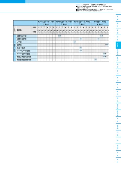 本郷麹町新宿池袋秋葉原自由が丘吉祥寺調布立川町田厚木藤沢横浜あざみ野金沢文庫大宮南浦和川越柏津田沼千葉水戸12/15(月)~12/17(水)12/20(土)~12/24(水)12/26(金)~12/30(火)1/2(金)~1/6(火)1ターム2ターム3ターム4ターム12345612345612345612345609:00〜10:3010:50〜12:2013:20〜14:5015:10〜16:4017:00〜18:3018:50〜20:2009:00〜10:3010:50〜12:2013:20〜14:5015:10〜16:4017:00〜18:3018:50〜20:2009:00〜10:3010:50〜12:2013:20〜14:5015:10〜16:4017:00〜18:3018:50〜20:2009:00〜10:3010:50〜12:2013:20〜14:5015:10〜16:4017:00〜18:3018:50〜20:20時限時間坂本(勝)大内沼田吉田富増坂本(勝)沼田平尾(雅)平尾(雅)坂本(勝)髙岡早慶大日本史早慶大世界史日本史世界史政治・経済テーマ日本文化史テーマ世界文化史戦後日本史完全攻略戦後世界史徹底攻略地歴・公民講座名教科●2025年度/冬期講習/東日本/秋葉原/高3・卒生/パターン14452025_57_3_368_11_20250714192026.csv/2ページ校了時削除