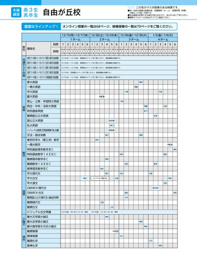 12/15(月)~12/17(水)12/20(土)~12/24(水)12/26(金)~12/30(火)1/2(金)~1/6(火)1ターム2ターム3ターム4ターム12345612345612345612345609:00〜10:3010:50〜12:2013:20〜14:5015:10〜16:4017:00〜18:3018:50〜20:2009:00〜10:3010:50〜12:2013:20〜14:5015:10〜16:4017:00〜18:3018:50〜20:2009:00〜10:3010:50〜12:2013:20〜14:5015:10〜16:4017:00〜18:3018:50〜20:2009:00〜10:3010:50〜12:2013:20〜14:5015:10〜16:4017:00〜18:3018:50〜20:20時限時間講座名共通テスト本番リハーサルテスト【理系6教科】校舎受験)共通テスト本番リハーサルテスト【文系6教科】校舎受験)共通テスト本番リハーサルテスト【理系3教科】校舎受験)共通テスト本番リハーサルテスト【文系3教科】校舎受験)共通テスト本番リハーサルテスト【英数国型】校舎受験)東大英語一橋大英語早大英語慶大英語青山・立教・学習院大英語明治・中央・法政大英語特別選抜英語難関国公立大英語国公立大英語私大英語ハイレベル超長文英語読解(私大編)文法・語法攻略東京科学大(理工系)数学一橋大数学特別選抜理系数学ⅢC特別選抜数学ⅠAⅡBC難関理系数学ⅢC難関数学ⅠAⅡBC標準理系数学ⅢC早大現代文早大古文早大漢文GMARCH現代文GMARCH古文難関国公立大現代文(論述対策)難関現代文難関古文ビジュアル古文常識慶大文学部小論文慶大法学部小論文慶大商学部B方式小論文難関物理標準物理難関化学標準化学12/20(土)・12/21(日)時間割は3ページをご覧ください。解説講義は映像です。4ページ覧くだ。解説は映像。12/20(土)・12/21(日)時間割は3ページをご覧ください。解説講義は映像です。4ページ覧くだ。解説は映像。12/20(土)・12/21(日)時間割は3ページをご覧ください。解説講義は映像です。4ページ覧くだ。解説は映像。12/20(土)時間割は3ページをご覧ください。解説講義は映像です。4ペをご覧さい。講義はです。12/18(木)・12/19(金)時間割は4ページをご覧ください。解説講義は映像です。3ページ覧くだ。解説は映像。瀬﨑明慶二本柳天倉髙橋(慶)二本柳天倉明慶森(千)吉田尾崎伊東(敦)横田横田松田松田香坂池田(廉)清川髙橋(慶)板谷清川堀尾板谷菊川木村大窪隼坂12/17は5限のみ大野脇坂三河大窪上田12/19(金)09:00〜12:20隼坂12/19(金)13:20〜16:40隼坂青田隼坂光田隼坂清水(直)中野(喜)杉山飛田飛田小竹西尾教科共通テスト対策英語数学国語小論文理科自由が丘校●2025年度/冬期講習/東日本/自由が丘/高3・卒生/パターン14452025_57_3_337_11_20250714204613.csv/1ページ校了時削除