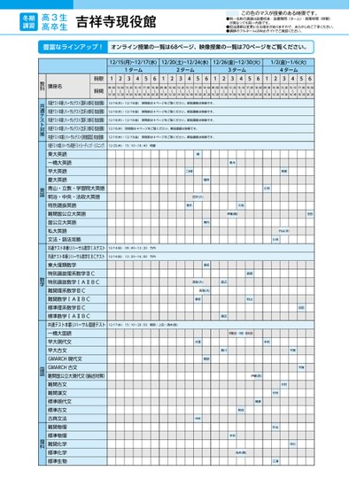 吉祥寺現役館12/15(月)~12/17(水)12/20(土)~12/24(水)12/26(金)~12/30(火)1/2(金)~1/6(火)1ターム2ターム3ターム4ターム12345612345612345612345609:00〜10:3010:50〜12:2013:20〜14:5015:10〜16:4017:00〜18:3018:50〜20:2009:00〜10:3010:50〜12:2013:20〜14:5015:10〜16:4017:00〜18:3018:50〜20:2009:00〜10:3010:50〜12:2013:20〜14:5015:10〜16:4017:00〜18:3018:50〜20:2009:00〜10:3010:50〜12:2013:20〜14:5015:10〜16:4017:00〜18:3018:50〜20:20時限時間講座名共通テスト本番リハーサルテスト【理系6教科】校舎受験)共通テスト本番リハーサルテスト【文系6教科】校舎受験)共通テスト本番リハーサルテスト【理系3教科】校舎受験)共通テスト本番リハーサルテスト【文系3教科】校舎受験)共通テスト本番リハーサルテスト【英数国型】校舎受験)共通テスト本番リハーサル英語テスト(リーディング・リスニング)東大英語一橋大英語早大英語慶大英語青山・立教・学習院大英語明治・中央・法政大英語特別選抜英語難関国公立大英語国公立大英語私大英語文法・語法攻略共通テスト本番リハーサル数学ⅠAテスト共通テスト本番リハーサル数学ⅡBCテスト東大理類数学特別選抜理系数学ⅢC特別選抜数学ⅠAⅡBC難関理系数学ⅢC難関数学ⅠAⅡBC標準理系数学ⅢC標準数学ⅠAⅡBC共通テスト本番リハーサル国語テスト一橋大国語早大現代文早大古文GMARCH現代文GMARCH古文難関国公立大現代文(論述対策)難関古文難関漢文標準現代文標準古文古典文法難関物理標準物理難関化学標準化学標準生物12/20(土)・12/21(日)時間割は3ページをご覧ください。解説講義は映像です。4ページ覧くだ。解説は映像。12/20(土)・12/21(日)時間割は3ページをご覧ください。解説講義は映像です。4ページ覧くだ。解説は映像。12/20(土)・12/21(日)時間割は3ページをご覧ください。解説講義は映像です。4ページ覧くだ。解説は映像。12/20(土)時間割は3ページをご覧ください。解説講義は映像です。4ペをご覧さい。講義はです。12/18(木)・12/19(金)時間割は4ページをご覧ください。解説講義は映像です。3ページ覧くだ。解説は映像。12/25(木)15:10〜18:40明慶12/14(日)09:40〜12:20竹内12/14(日)13:20〜16:00竹内12/17(水)15:10〜20:50軽部・上田・酒井(辰)青木久地伊藤(剛)青柳小林吉田内山(洋)小林墺二本柳田中(久)青木礒貝東内香坂高梨(大)渡辺高梨(大)香坂長野秋山大窪軽部中村窪田貴川伊藤(武)・中西・酒井(辰)木村迫田平賀平賀伊藤(武)軽部中村中村和田木村向井(勇)杉山三浦早川教科共通テスト対策英語数学国語理科●2025年度/冬期講習/東日本/吉祥寺/高3・卒生/パターン14452025_57_3_340_11_20250717091906.csv/1ページ校了時削除
