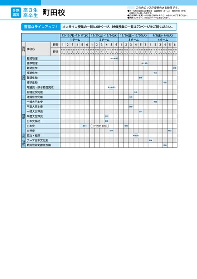 冬期講習高3生高卒生町田校この色のマスが授業のある時限です。●同一名称の講座は設置校舎・設置期間(ターム)・授業時間(時限)が異なっても同一内容です。●担当講師は変更になる場合がありますので、あらかじめご了承ください。●講師のフルネームはWebサイトでご確認ください。12/15(月)~12/17(水)12/20(土)~12/24(水)12/26(金)~12/30(火)1/2(金)~1/6(火)1ターム2ターム3ターム4ターム12345612345612345612345609:00〜10:3010:50〜12:2013:20〜14:5015:10〜16:4017:00〜18:3018:50〜20:2009:00〜10:3010:50〜12:2013:20〜14:5015:10〜16:4017:00〜18:3018:50〜20:2009:00〜10:3010:50〜12:2013:20〜14:5015:10〜16:4017:00〜18:3018:50〜20:2009:00〜10:3010:50〜12:2013:20〜14:5015:10〜16:4017:00〜18:3018:50〜20:20時限時間講座名教科佐々木(哲)井上(順)安達牧島早川森脇唐牛山内永井永井安部佐々木(哲)佐々木森脇黒川12/17は5限のみ安部佐々木桐山平尾(則)森脇桐山難関物理標準物理難関化学標準化学難関生物標準生物電磁気・原子物理完成有機化学完成理論化学完成一橋大日本史早慶大日本史一橋大世界史早慶大世界史日本史論述日本史世界史政治・経済テーマ日本文化史戦後世界史徹底攻略理科地歴公民地歴●2025年度/冬期講習/東日本/町田/高3・卒生/パターン14452025_57_3_325_11_20250717203256.csv/2ページ校了時削除