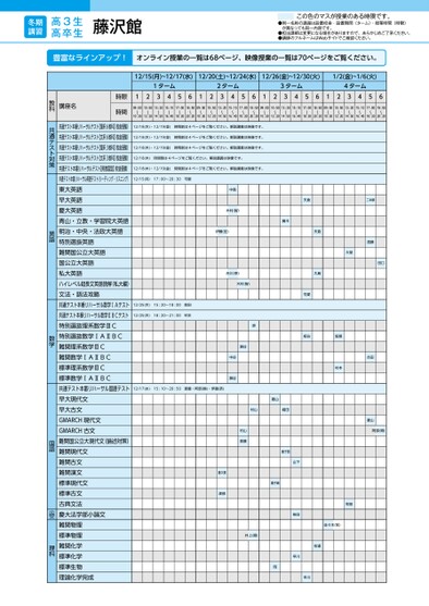 冬期講習高3生高卒生藤沢館この色のマスが授業のある時限です。●同一名称の講座は設置校舎・設置期間(ターム)・授業時間(時限)が異なっても同一内容です。●担当講師は変更になる場合がありますので、あらかじめご了承ください。●講師のフルネームはWebサイトでご確認ください。12/15(月)~12/17(水)12/20(土)~12/24(水)12/26(金)~12/30(火)1/2(金)~1/6(火)1ターム2ターム3ターム4ターム12345612345612345612345609:00〜10:3010:50〜12:2013:20〜14:5015:10〜16:4017:00〜18:3018:50〜20:2009:00〜10:3010:50〜12:2013:20〜14:5015:10〜16:4017:00〜18:3018:50〜20:2009:00〜10:3010:50〜12:2013:20〜14:5015:10〜16:4017:00〜18:3018:50〜20:2009:00〜10:3010:50〜12:2013:20〜14:5015:10〜16:4017:00〜18:3018:50〜20:20時限時間講座名共通テスト本番リハーサルテスト【理系6教科】校舎受験)共通テスト本番リハーサルテスト【文系6教科】校舎受験)共通テスト本番リハーサルテスト【理系3教科】校舎受験)共通テスト本番リハーサルテスト【文系3教科】校舎受験)共通テスト本番リハーサルテスト【英数国型】校舎受験)共通テスト本番リハーサル英語テスト(リーディング・リスニング)東大英語早大英語慶大英語青山・立教・学習院大英語明治・中央・法政大英語特別選抜英語難関国公立大英語国公立大英語私大英語ハイレベル超長文英語読解(私大編)文法・語法攻略共通テスト本番リハーサル数学ⅠAテスト共通テスト本番リハーサル数学ⅡBCテスト特別選抜理系数学ⅢC特別選抜数学ⅠAⅡBC難関理系数学ⅢC難関数学ⅠAⅡBC標準理系数学ⅢC標準数学ⅠAⅡBC共通テスト本番リハーサル国語テスト早大現代文早大古文GMARCH現代文GMARCH古文難関国公立大現代文(論述対策)難関現代文難関古文難関漢文標準現代文標準古文古典文法慶大法学部小論文難関物理標準物理難関化学標準化学標準生物理論化学完成12/20(土)・12/21(日)時間割は3ページをご覧ください。解説講義は映像です。4ページ覧くだ。解説は映像。12/20(土)・12/21(日)時間割は3ページをご覧ください。解説講義は映像です。4ページ覧くだ。解説は映像。12/20(土)・12/21(日)時間割は3ページをご覧ください。解説講義は映像です。4ページ覧くだ。解説は映像。12/20(土)時間割は3ページをご覧ください。解説講義は映像です。4ペをご覧さい。講義はです。12/18(木)・12/19(金)時間割は4ページをご覧ください。解説講義は映像です。3ページ覧くだ。解説は映像。12/15(月)17:00〜20:30可愛中島木村(智)伊藤(宏)吉川(幸)木村(智)堺瀬谷中谷瀬谷天倉二本柳鏑木天倉大島可愛遠藤大胡田口板谷堀尾合田村本12/25(木)15:20〜18:00前田12/25(木)18:20〜21:00村本12/17(水)15:10〜20:50斎藤・阿部(順)・伊藤(恭)菱山阿部(順)菱山村山福田村山斎藤鹿子島山下鹿子島喜久里渡部井上(順)税田佐々木(哲)安達柴田早川岡早川教科共通テスト対策英語数学国語小論文理科●2025年度/冬期講習/東日本/藤沢/高3・卒生/パターン14452025_57_3_331_11_20250717091906.csv/1ページ校了時削除