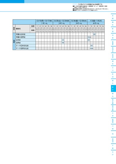 この色のマスが授業のある時限です。●同一名称の講座は設置校舎・設置期間(ターム)・授業時間(時限)が異なっても同一内容です。●担当講師は変更になる場合がありますので、あらかじめご了承ください。●講師のフルネームはWebサイトでご確認ください。本郷麹町新宿池袋秋葉原自由が丘吉祥寺調布立川町田厚木藤沢横浜あざみ野金沢文庫大宮南浦和川越柏津田沼千葉水戸12/15(月)~12/17(水)12/20(土)~12/24(水)12/26(金)~12/30(火)1/2(金)~1/6(火)1ターム2ターム3ターム4ターム12345612345612345612345609:00〜10:3010:50〜12:2013:20〜14:5015:10〜16:4017:00〜18:3018:50〜20:2009:00〜10:3010:50〜12:2013:20〜14:5015:10〜16:4017:00〜18:3018:50〜20:2009:00〜10:3010:50〜12:2013:20〜14:5015:10〜16:4017:00〜18:3018:50〜20:2009:00〜10:3010:50〜12:2013:20〜14:5015:10〜16:4017:00〜18:3018:50〜20:20時限時間太田斉藤依田平尾(雅)依田依田平尾(雅)早慶大日本史早慶大世界史日本史世界史テーマ日本文化史テーマ世界文化史地歴講座名教科●2025年度/冬期講習/東日本/藤沢/高3・卒生/パターン14452025_57_3_331_11_20250717091906.csv/2ページ校了時削除