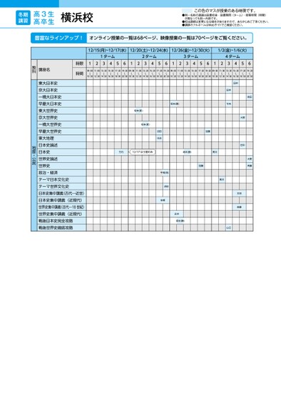 冬期講習高3生高卒生横浜校この色のマスが授業のある時限です。●同一名称の講座は設置校舎・設置期間(ターム)・授業時間(時限)が異なっても同一内容です。●担当講師は変更になる場合がありますので、あらかじめご了承ください。●講師のフルネームはWebサイトでご確認ください。12/15(月)~12/17(水)12/20(土)~12/24(水)12/26(金)~12/30(火)1/2(金)~1/6(火)1ターム2ターム3ターム4ターム12345612345612345612345609:00〜10:3011:00〜12:3013:20〜14:5015:20〜16:5017:20〜18:5019:20〜20:5009:00〜10:3011:00〜12:3013:20〜14:5015:20〜16:5017:20〜18:5019:20〜20:5009:00〜10:3011:00〜12:3013:20〜14:5015:20〜16:5017:20〜18:5019:20〜20:5009:00〜10:3011:00〜12:3013:20〜14:5015:20〜16:5017:20〜18:5019:20〜20:50時限時間講座名教科坂本(勝)坂本(新)坂本(新)沼田中井加藤竹内12/17は5限のみ坂本(勝)黒川加藤黒川平尾(則)沼田安部永井坂本(勝)田中田中竹内大野田中依田大野斉藤太田斉藤山口東大日本史京大日本史一橋大日本史早慶大日本史東大世界史京大世界史一橋大世界史早慶大世界史東大地理日本史論述日本史世界史論述世界史政治・経済テーマ日本文化史テーマ世界文化史日本史集中講義(古代―近世)日本史集中講義(近現代)世界史集中講義(古代―18世紀)世界史集中講義(近現代)戦後日本史完全攻略戦後世界史徹底攻略地歴・公民●2025年度/冬期講習/東日本/横浜/高3・卒生/パターン14452025_57_3_321_11_20250717091906.csv/3ページ校了時削除