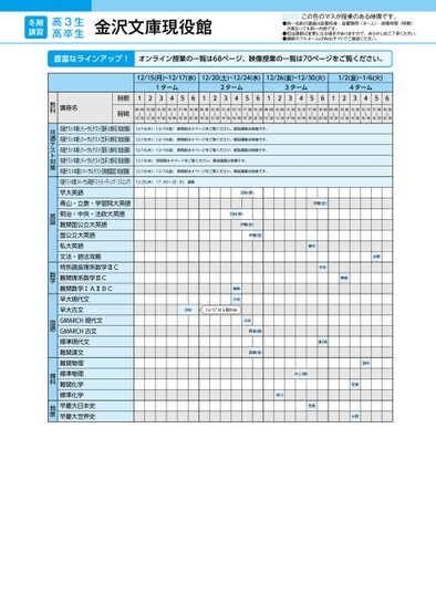 冬期講習高3生高卒生金沢文庫現役館この色のマスが授業のある時限です。●同一名称の講座は設置校舎・設置期間(ターム)・授業時間(時限)が異なっても同一内容です。●担当講師は変更になる場合がありますので、あらかじめご了承ください。●講師のフルネームはWebサイトでご確認ください。12/15(月)~12/17(水)12/20(土)~12/24(水)12/26(金)~12/30(火)1/2(金)~1/6(火)1ターム2ターム3ターム4ターム12345612345612345612345609:00〜10:3010:50〜12:2013:20〜14:5015:10〜16:4017:00〜18:3018:50〜20:2009:00〜10:3010:50〜12:2013:20〜14:5015:10〜16:4017:00〜18:3018:50〜20:2009:00〜10:3010:50〜12:2013:20〜14:5015:10〜16:4017:00〜18:3018:50〜20:2009:00〜10:3010:50〜12:2013:20〜14:5015:10〜16:4017:00〜18:3018:50〜20:20時限時間講座名12/20(土)・12/21(日)時間割は3ページをご覧ください。解説講義は映像です。4ページ覧くだ。解説は映像。12/20(土)・12/21(日)時間割は3ページをご覧ください。解説講義は映像です。4ページ覧くだ。解説は映像。12/20(土)・12/21(日)時間割は3ページをご覧ください。解説講義は映像です。4ページ覧くだ。解説は映像。12/20(土)時間割は3ページをご覧ください。解説講義は映像です。4ペをご覧さい。講義はです。12/18(木)・12/19(金)時間割は4ページをご覧ください。解説講義は映像です。3ページ覧くだ。解説は映像。12/25(木)17:00〜20:30遠藤田村(修)田村(修)伊藤(宏)伊藤(宏)福島小池太田12/17は5限のみ小池阿部(順)髙橋(佳)共通テスト本番リハーサルテスト【理系6教科】校舎受験)共通テスト本番リハーサルテスト【文系6教科】校舎受験)共通テスト本番リハーサルテスト【理系3教科】校舎受験)共通テスト本番リハーサルテスト【文系3教科】校舎受験)共通テスト本番リハーサルテスト【英数国型】校舎受験)共通テスト本番リハーサル英語テスト(リーディング・リスニング)早大英語青山・立教・学習院大英語明治・中央・法政大英語難関国公立大英語国公立大英語私大英語文法・語法攻略特別選抜理系数学ⅢC難関理系数学ⅢC難関数学ⅠAⅡBC早大現代文早大古文GMARCH現代文GMARCH古文標準現代文難関漢文難関物理標準物理難関化学標準化学早慶大日本史早慶大世界史伊藤(宏)鏑木水野中谷横田鹿子島井上(順)早川安部酒井安達大野教科共通テスト対策英語数学国語理科地歴●2025年度/冬期講習/東日本/金沢文庫/高3・卒生/パターン14452025_57_3_335_11_20250714192006.csv/1ページ校了時削除