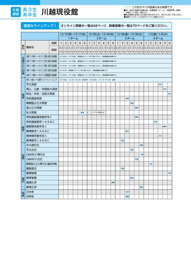 冬期講習高3生高卒生川越現役館この色のマスが授業のある時限です。●同一名称の講座は設置校舎・設置期間(ターム)・授業時間(時限)が異なっても同一内容です。●担当講師は変更になる場合がありますので、あらかじめご了承ください。●講師のフルネームはWebサイトでご確認ください。12/15(月)~12/17(水)12/20(土)~12/24(水)12/26(金)~12/30(火)1/2(金)~1/6(火)1ターム2ターム3ターム4ターム12345612345612345612345609:00〜10:3010:50〜12:2013:20〜14:5015:10〜16:4017:00〜18:3018:50〜20:2009:00〜10:3010:50〜12:2013:20〜14:5015:10〜16:4017:00〜18:3018:50〜20:2009:00〜10:3010:50〜12:2013:20〜14:5015:10〜16:4017:00〜18:3018:50〜20:2009:00〜10:3010:50〜12:2013:20〜14:5015:10〜16:4017:00〜18:3018:50〜20:20時限時間講座名共通テスト本番リハーサルテスト【理系6教科】校舎受験)共通テスト本番リハーサルテスト【文系6教科】校舎受験)共通テスト本番リハーサルテスト【理系3教科】校舎受験)共通テスト本番リハーサルテスト【文系3教科】校舎受験)共通テスト本番リハーサルテスト【英数国型】校舎受験)共通テスト本番リハーサル英語テスト(リーディング・リスニング)早大英語青山・立教・学習院大英語明治・中央・法政大英語特別選抜英語難関国公立大英語国公立大英語私大英語特別選抜理系数学ⅢC特別選抜数学ⅠAⅡBC難関理系数学ⅢC難関数学ⅠAⅡBC標準理系数学ⅢC標準数学ⅠAⅡBC早大現代文早大古文GMARCH現代文GMARCH古文難関国公立大現代文(論述対策)難関漢文難関物理標準物理難関化学標準化学日本史世界史12/20(土)・12/21(日)時間割は3ページをご覧ください。解説講義は映像です。4ページ覧くだ。解説は映像。12/20(土)・12/21(日)時間割は3ページをご覧ください。解説講義は映像です。4ページ覧くだ。解説は映像。12/20(土)・12/21(日)時間割は3ページをご覧ください。解説講義は映像です。4ページ覧くだ。解説は映像。12/20(土)時間割は3ページをご覧ください。解説講義は映像です。4ペをご覧さい。講義はです。12/18(木)・12/19(金)時間割は4ページをご覧ください。解説講義は映像です。3ページ覧くだ。解説は映像。12/14(日)13:20〜16:50田村(修)12/25(木)15:10〜18:40金城金城12/17は5限のみ早川早川早川河本佐藤(仁)古川小林木村金城金城栗原秦野亀山今田松藤一瀬平賀平賀長谷川西尾太田斉藤打越國兼教科共通テスト対策英語数学国語理科地歴●2025年度/冬期講習/東日本/川越/高3・卒生/パターン14452025_57_3_333_11_20250717091906.csv/1ページ校了時削除