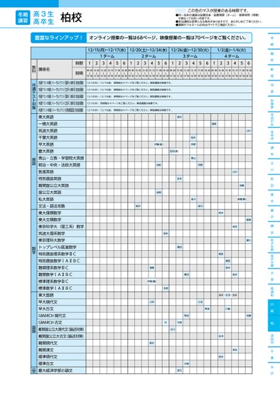 本郷麹町新宿池袋秋葉原自由が丘吉祥寺調布立川町田厚木藤沢横浜あざみ野金沢文庫大宮南浦和川越柏津田沼千葉水戸12/15(月)~12/17(水)12/20(土)~12/24(水)12/26(金)~12/30(火)1/2(金)~1/6(火)1ターム2ターム3ターム4ターム12345612345612345612345609:00〜10:3010:50〜12:2013:20〜14:5015:10〜16:4017:00〜18:3018:50〜20:2009:00〜10:3010:50〜12:2013:20〜14:5015:10〜16:4017:00〜18:3018:50〜20:2009:00〜10:3010:50〜12:2013:20〜14:5015:10〜16:4017:00〜18:3018:50〜20:2009:00〜10:3010:50〜12:2013:20〜14:5015:10〜16:4017:00〜18:3018:50〜20:20時限時間講座名共通テスト本番リハーサルテスト【理系6教科】校舎受験)共通テスト本番リハーサルテスト【文系6教科】校舎受験)共通テスト本番リハーサルテスト【理系3教科】校舎受験)共通テスト本番リハーサルテスト【文系3教科】校舎受験)共通テスト本番リハーサルテスト【英数国型】校舎受験)東大英語一橋大英語筑波大英語千葉大英語早大英語慶大英語青山・立教・学習院大英語明治・中央・法政大英語医進英語特別選抜英語難関国公立大英語国公立大英語私大英語文法・語法攻略東大理類数学東大文類数学東京科学大(理工系)数学筑波大理系数学東京理科大数学トップレベル医進数学特別選抜理系数学ⅢC特別選抜数学ⅠAⅡBC難関理系数学ⅢC難関数学ⅠAⅡBC標準理系数学ⅢC標準数学ⅠAⅡBC東大国語早大現代文早大古文GMARCH現代文GMARCH古文難関国公立大現代文(論述対策)難関国公立大古文(論述対策)難関現代文難関漢文標準現代文標準古文慶大経済学部小論文12/20(土)・12/21(日)時間割は3ページをご覧ください。解説講義は映像です。4ページ覧くだ。解説は映像。12/20(土)・12/21(日)時間割は3ページをご覧ください。解説講義は映像です。4ページ覧くだ。解説は映像。12/20(土)・12/21(日)時間割は3ページをご覧ください。解説講義は映像です。4ページ覧くだ。解説は映像。12/20(土)時間割は3ページをご覧ください。解説講義は映像です。4ペをご覧さい。講義はです。12/18(木)・12/19(金)時間割は4ページをご覧ください。解説講義は映像です。3ページ覧くだ。解説は映像。高沢篠原桜井仲野高山仲野成川成川伊藤(直)田村(喜)岩舩岩間高沢宮本永島遠藤伊東(鋼)松本郷田郷田山川飯島夏川加藤高橋(勝)山川成合鈴木郷田郷田鈴木鈴木鈴木・佐河・宮本小林小池隼坂川崎荒田松藤中今西立川鈴木川崎宮元佐河鈴木宮本教科共通テスト対策英語数学国語小論文●2025年度/冬期講習/東日本/柏/高3・卒生/パターン14452025_57_3_322_11_20250717091906.csv/1ページ校了時削除冬期講習高3生高卒生柏校この色のマスが授業のある時限です。●同一名称の講座は設置校舎・設置期間(ターム)・授業時間(時限)が異なっても同一内容です。●担当講師は変更になる場合がありますので、あらかじめご了承ください。●講師のフルネームはWebサイトでご確認ください。