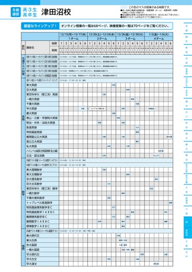 本郷麹町新宿池袋秋葉原自由が丘吉祥寺調布立川町田厚木藤沢横浜あざみ野金沢文庫大宮南浦和川越柏津田沼千葉水戸冬期講習高3生高卒生津田沼校この色のマスが授業のある時限です。●同一名称の講座は設置校舎・設置期間(ターム)・授業時間(時限)が異なっても同一内容です。●担当講師は変更になる場合がありますので、あらかじめご了承ください。●講師のフルネームはWebサイトでご確認ください。12/15(月)~12/17(水)12/20(土)~12/24(水)12/26(金)~12/30(火)1/2(金)~1/6(火)1ターム2ターム3ターム4ターム12345612345612345612345609:00〜10:3010:50〜12:2013:20〜14:5015:10〜16:4017:00〜18:3018:50〜20:2009:00〜10:3010:50〜12:2013:20〜14:5015:10〜16:4017:00〜18:3018:50〜20:2009:00〜10:3010:50〜12:2013:20〜14:5015:10〜16:4017:00〜18:3018:50〜20:2009:00〜10:3010:50〜12:2013:20〜14:5015:10〜16:4017:00〜18:3018:50〜20:20時限時間講座名12/20(土)・12/21(日)時間割は3ページをご覧ください。解説講義は映像です。4ページ覧くだ。解説は映像。12/20(土)・12/21(日)時間割は3ページをご覧ください。解説講義は映像です。4ページ覧くだ。解説は映像。12/20(土)・12/21(日)時間割は3ページをご覧ください。解説講義は映像です。4ページ覧くだ。解説は映像。12/20(土)時間割は3ページをご覧ください。解説講義は映像です。4ペをご覧さい。講義はです。12/18(木)・12/19(金)時間割は4ページをご覧ください。解説講義は映像です。3ページ覧くだ。解説は映像。12/16(火)17:00〜20:30是枝丹羽新野久野新野石橋伊藤(直)近嵐12/17は5限のみ近嵐仲野石橋仲野日髙久野石橋日髙天野12/14(日)13:20〜16:00宮本12/14(日)16:20〜19:00宮本天野12/25(木)13:20〜19:00小宮・中西・光田小山新野護守田村(喜)田村(喜)えんどう宮本成合遠藤宮本遠藤山崎兵頭川崎酒井(辰)日髙久野飯島飯島柳沢島田飯島柳沢大窪藤澤・中村大窪・藤澤大窪・中西・豊崎木下三木三木天野平賀共通テスト本番リハーサルテスト【理系6教科】校舎受験)共通テスト本番リハーサルテスト【文系6教科】校舎受験)共通テスト本番リハーサルテスト【理系3教科】校舎受験)共通テスト本番リハーサルテスト【文系3教科】校舎受験)共通テスト本番リハーサルテスト【英数国型】校舎受験)共通テスト本番リハーサル英語テスト(リーディング・リスニング)東大英語京大英語東京科学大(理工系)英語一橋大英語千葉大英語早大英語慶大英語青山・立教・学習院大英語明治・中央・法政大英語医進英語特別選抜英語難関国公立大英語国公立大英語私大英語ハイレベル超長文英語読解(私大編)文法・語法攻略共通テスト本番リハーサル数学ⅠAテスト共通テスト本番リハーサル数学ⅡBCテスト東大理類数学東大文類数学京大理系数学京大文系数学東京科学大(理工系)数学一橋大数学千葉大理系数学トップレベル医進数学特別選抜理系数学ⅢC特別選抜数学ⅠAⅡBC難関理系数学ⅢC難関数学ⅠAⅡBC標準数学ⅠAⅡBC共通テスト本番リハーサル国語テスト東大現代文東大古典京大国語一橋大国語早大現代文早大古文早大漢文教科共通テスト対策英語数学国語●2025年度/冬期講習/東日本/津田沼/高3・卒生/パターン14452025_57_3_327_11_20250717104438.csv/1ページ校了時削除