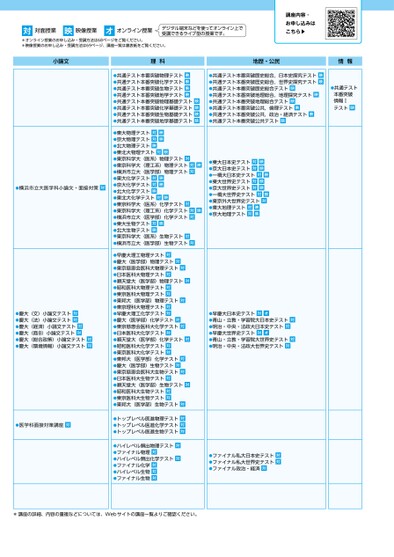対対面授業映映像授業オオンライン授業デジタル端末などを使ってオンライン上で受講できるライブ型の授業です。*オンライン授業のお申し込み・受講方法は68ページをご覧ください。*映像授業のお申し込み・受講方法は69ページ、講座一覧は裏表紙をご覧ください。講座内容・お申し込みはこちら▶小論文理科地歴・公民情報●共通テスト本番突破物理テスト映●共通テスト本番突破化学テスト映●共通テスト本番突破生物テスト映●共通テスト本番突破地学テスト映●共通テスト本番突破物理基礎テスト映●共通テスト本番突破化学基礎テスト映●共通テスト本番突破生物基礎テスト映●共通テスト本番突破地学基礎テスト映●東大物理テスト対映●京大物理テスト対映●北大物理テスト映●東北大物理テスト対映●東京科学大(医系)物理テスト対●東京科学大(理工系)物理テスト対映●横浜市立大(医学部)物理テスト対●東大化学テスト対映●京大化学テスト対映●北大化学テスト映●東北大化学テスト対映●東京科学大(医系)化学テスト対●東京科学大(理工系)化学テスト対映●横浜市立大(医学部)化学テスト対●東大生物テスト対映●北大生物テスト映●東京科学大(医系)生物テスト対●横浜市立大(医学部)生物テスト対●早慶大理工物理テスト対●慶大(医学部)物理テスト対●東京慈恵会医科大物理テスト対●日本医科大物理テスト対●順天堂大(医学部)物理テスト対●昭和医科大物理テスト対●東京医科大物理テスト対●東邦大(医学部)物理テスト対●東京理科大物理テスト対●早慶大理工化学テスト対●慶大(医学部)化学テスト対●東京慈恵会医科大化学テスト対●日本医科大化学テスト対●順天堂大(医学部)化学テスト対●昭和医科大化学テスト対●東京医科大化学テスト対●東邦大(医学部)化学テスト対●慶大(医学部)生物テスト対●東京慈恵会医科大生物テスト対●日本医科大生物テスト対●順天堂大(医学部)生物テスト対●昭和医科大生物テスト対●東京医科大生物テスト対●東邦大(医学部)生物テスト対●トップレベル医進物理テスト対●トップレベル医進化学テスト対●トップレベル医進生物テスト対●ハイレベル頻出物理テスト対●ファイナル物理対●ハイレベル頻出化学テスト対●ファイナル化学対●ハイレベル生物対●ファイナル生物対●横浜市立大医学科小論文・面接対策対●慶大(文)小論文テスト対●慶大(法)小論文テスト対●慶大(経済)小論文テスト対●慶大(商B)小論文テスト対●慶大(総合政策)小論文テスト対●慶大(環境情報)小論文テスト対●医学科面接対策講座対*講座の詳細、内容の重複などについては、Webサイトの講座一覧よりご確認ください。●共通テスト本番突破歴史総合,日本史探究テスト映●共通テスト本番突破歴史総合,世界史探究テスト映●共通テスト本番突破歴史総合テスト映●共通テスト本番突破地理総合,地理探究テスト映●共通テスト本番突破地理総合テスト映●共通テスト本番突破公共,倫理テスト映●共通テスト本番突破公共,政治・経済テスト映●共通テスト本番突破公共テスト映●共通テスト本番突破情報Ⅰテスト映●東大日本史テスト対映●京大日本史テスト対映●一橋大日本史テスト対映●東大世界史テスト対映●京大世界史テスト対映●一橋大世界史テスト対映●東京外大世界史テスト対●東大地理テスト対映●京大地理テスト対映●早慶大日本史テスト対オ●青山・立教・学習院大日本史テスト対●明治・中央・法政大日本史テスト対●早慶大世界史テスト対オ●青山・立教・学習院大世界史テスト対●明治・中央・法政大世界史テスト対●ファイナル私大日本史テスト対●ファイナル私大世界史テスト対●ファイナル政治・経済対
