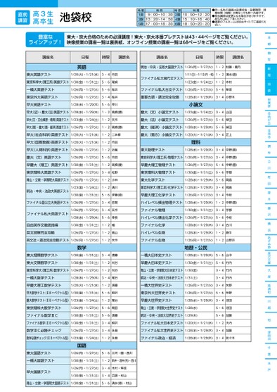 講座名日程時限講師名英語東大英語テスト1/20(火)・1/21(水)3・4丹羽東京科学大(理工系)英語テスト1/30(金)・1/31(土)5・6尾崎一橋大英語テスト1/26(月)・1/27(火)5・6桜井東京外大英語テスト1/26(月)・1/27(火)3・4桜井早大英語テスト1/28(水)・1/29(木)5・6早川早大(法)・慶大(法)英語テスト1/28(水)・1/29(木)1・2高橋(勝)早大(文・文化構想・教育)英語テスト1/23(金)・1/24(土)1・2矢作早大(商)・慶大(商・経済)英語テスト1/26(月)・1/27(火)1・2高橋(勝)早大(社会科学)英語テスト1/20(火)・1/21(水)1・2二本柳早大(国際教養)英語テスト1/20(火)・1/21(水)1・2丹羽早大(人間科学)英語テスト1/26(月)・1/27(火)1・2近嵐慶大(文)英語テスト1/26(月)・1/27(火)5・6丹羽早慶大(理工)英語テスト1/30(金)・1/31(土)1・2髙橋(慶)東京理科大英語テスト1/26(月)・1/27(火)3・4松野青山・立教・学習院大英語テスト1/26(月)・1/27(火)1・2小林明治・中央・法政大英語テスト1/23(金)・1/24(土)1・2清川1/30(金)・1/31(土)5・6伊藤(直)ファイナル国公立大英語テスト1/26(月)・1/27(火)3・4岩間ファイナル私大英語テスト1/26(月)・1/27(火)3・4矢作1/28(水)・1/29(木)5・6幸長自由英作文徹底指導1/30(金)・1/31(土)1・2幅英文読解完全攻略1/26(月)・1/27(火)1・2高山英文法・語法完全攻略テスト1/26(月)・1/27(火)1・2矢作数学東大理類数学テスト1/30(金)・1/31(土)3・4須藤東大文類数学テスト1/30(金)・1/31(土)1・2刈谷東京科学大(理工系)数学テスト1/26(月)・1/27(火)1・2刈谷一橋大数学テスト1/28(水)・1/29(木)3・4尾台早慶大理工数学テスト1/20(火)・1/21(水)1・2須藤早大数学テスト(ⅡB+ベクトル型)1/30(金)・1/31(土)5・6柳沢慶大数学テスト(ⅡB+ベクトル型)1/23(金)・1/24(土)1・2尾台東京理科大数学テスト1/26(月)・1/27(火)5・6岡田ファイナル数学ⅢC1/30(金)・1/31(土)5・6須藤ファイナル数学(ⅡB+ベクトル型)1/30(金)・1/31(土)3・4柳沢数学ⅢC必勝チェック1/26(月)・1/27(火)3・4永島数学必勝チェック(ⅡB+ベクトル型)1/23(金)・1/24(土)1・2永島国語東大国語テスト1/26(月)・1/27(火)5・6三河・園・西川一橋大国語テスト1/30(金)・1/31(土)1・2新井・酒井(完)・西川早大国語テスト1/26(月)・1/27(火)3・4木村・隼坂1/30(金)・1/31(土)3・4兵頭・村山青山・立教・学習院大国語テスト1/30(金)・1/31(土)5・6清水(直)・村山講座名日程時限講師名明治・中央・法政大国語テスト1/26(月)・1/27(火)1・2松藤・鹿内ファイナル私大現代文テスト1/11(日)・1/12(月・祝)1・2清水(直)1/23(金)・1/24(土)1・2木村ファイナル私大古文テスト1/26(月)・1/27(火)5・6隼坂重要古語・語法完全攻略1/28(水)・1/29(木)3・4小野木小論文慶大(文)小論文テスト1/23(金)・1/24(土)3・4山田慶大(法)小論文テスト1/26(月)・1/27(火)5・6柴田慶大(経済)小論文テスト1/28(水)・1/29(木)5・6柴田慶大(商B)小論文テスト1/20(火)・1/21(水)3・4正上理科東大物理テスト1/28(水)・1/29(木)3・4中野(喜)東京科学大(理工系)物理テスト1/26(月)・1/27(火)3・4中野(喜)早慶大理工物理テスト1/26(月)・1/27(火)5・6中野(喜)東京理科大物理テスト1/30(金)・1/31(土)5・6宇都東大化学テスト1/28(水)・1/29(木)5・6岡島東京科学大(理工系)化学テスト1/28(水)・1/29(木)3・4岡島早慶大理工化学テスト1/26(月)・1/27(火)3・4今枝ハイレベル頻出物理テスト1/28(水)・1/29(木)1・2中野(喜)ファイナル物理1/30(金)・1/31(土)3・4宇都ハイレベル頻出化学テスト1/26(月)・1/27(火)5・6今枝ファイナル化学1/28(水)・1/29(木)3・4古川ハイレベル生物1/28(水)・1/29(木)1・2唐牛ファイナル生物1/26(月)・1/27(火)1・2山野井地歴・公民一橋大日本史テスト1/28(水)・1/29(木)5・6山中早慶大日本史テスト1/30(金)・1/31(土)5・6竹内青山・立教・学習院大日本史テスト1/30(金)3・4竹内明治・中央・法政大日本史テスト1/31(土)3・4竹内一橋大世界史テスト1/26(月)・1/27(火)3・4矢野東京外大世界史テスト1/26(月)・1/27(火)5・6矢野早慶大世界史テスト1/28(水)・1/29(木)3・4沼田青山・立教・学習院大世界史テスト1/28(水)5・6沼田明治・中央・法政大世界史テスト1/29(木)5・6加藤ファイナル私大日本史テスト1/20(火)・1/21(水)1・2大内ファイナル私大世界史テスト1/28(水)・1/29(木)3・4加藤ファイナル政治・経済1/28(水)・1/29(木)3・4佐々木本郷麹町新宿池袋秋葉原自由が丘吉祥寺調布立川町田厚木藤沢横浜あざみ野金沢文庫大宮南浦和川越柏津田沼千葉水戸池袋校