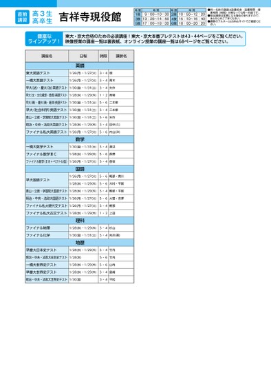吉祥寺現役館講座名日程時限講師名英語東大英語テスト一橋大英語テスト1/26(月)・1/27(火)3・4墺1/26(月)・1/27(火)3・4青木早大(法)・慶大(法)英語テスト1/30(金)・1/31(土)3・4矢作早大(文・文化構想・教育)英語テスト1/28(水)・1/29(木)1・2青柳早大(商)・慶大(商・経済)英語テスト1/30(金)・1/31(土)5・6二本柳早大(社会科学)英語テスト1/30(金)・1/31(土)3・4二本柳青山・立教・学習院大英語テスト1/30(金)・1/31(土)5・6矢作明治・中央・法政大英語テスト1/28(水)・1/29(木)3・4田中(久)ファイナル私大英語テスト1/26(月)・1/27(火)5・6内山(洋)数学一橋大数学テストファイナル数学ⅢC1/30(金)・1/31(土)3・4渡辺1/28(水)・1/29(木)5・6長野ファイナル数学(ⅡB+ベクトル型)1/26(月)・1/27(火)3・4香坂国語早大国語テスト1/26(月)・1/27(火)5・6軽部・貴川1/28(水)・1/29(木)5・6木村・平賀青山・立教・学習院大国語テスト1/28(水)・1/29(木)3・4軽部・平賀明治・中央・法政大国語テスト1/26(月)・1/27(火)5・6大窪・吉澤ファイナル私大現代文テスト1/26(月)・1/27(火)3・4軽部ファイナル私大古文テスト1/28(水)・1/29(木)1・2上田理科ファイナル物理ファイナル化学1/28(水)・1/29(木)3・4杉山1/30(金)・1/31(土)3・4向井(勇)地歴早慶大日本史テスト1/28(水)・1/29(木)3・4竹内明治・中央・法政大日本史テスト1/28(水)5・6竹内一橋大世界史テスト早慶大世界史テスト1/28(水)・1/29(木)5・6山内1/28(水)・1/29(木)3・4島崎明治・中央・法政大世界史テスト1/30(金)3・4平松