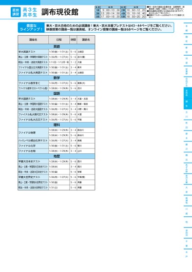 本郷麹町新宿池袋秋葉原自由が丘吉祥寺調布立川町田厚木藤沢横浜あざみ野金沢文庫大宮南浦和川越柏津田沼千葉水戸調布現役館講座名日程時限講師名英語早大英語テスト1/30(金)・1/31(土)5・6土岐田青山・立教・学習院大英語テスト1/26(月)・1/27(火)5・6吉川(量)明治・中央・法政大英語テスト1/11(日)・1/12(月・祝)1・2大島ファイナル国公立大英語テスト1/30(金)・1/31(土)3・4青木ファイナル私大英語テスト1/30(金)・1/31(土)3・4土岐田数学ファイナル数学ⅢC1/26(月)・1/27(火)5・6高梨(大)ファイナル数学(ⅡB+ベクトル型)1/28(水)・1/29(木)5・6流川国語早大国語テスト1/28(水)・1/29(木)3・4大窪・太田青山・立教・学習院大国語テスト1/30(金)・1/31(土)3・4軽部・税田明治・中央・法政大国語テスト1/26(月)・1/27(火)3・4川野・貴川ファイナル私大現代文テスト1/28(水)・1/29(木)5・6大窪ファイナル私大古文テスト1/26(月)・1/27(火)5・6平賀ファイナル物理理科1/28(水)・1/29(木)3・4長谷川1/28(水)・1/29(木)5・6長谷川ハイレベル頻出化学テスト1/26(月)・1/27(火)3・4西尾ファイナル化学ファイナル生物1/30(金)・1/31(土)5・6菊川1/28(水)・1/29(木)3・4山川地歴早慶大日本史テスト1/28(水)・1/29(木)5・6西川青山・立教・学習院大日本史テスト1/28(水)明治・中央・法政大日本史テスト1/30(金)3・4西川5・6安部早慶大世界史テスト1/26(月)・1/27(火)5・6平尾(雅)青山・立教・学習院大世界史テスト1/30(金)明治・中央・法政大世界史テスト1/31(土)5・6斉藤5・6斉藤