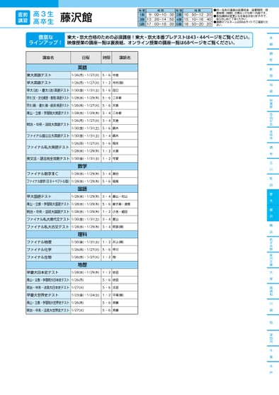 本郷麹町新宿池袋秋葉原自由が丘吉祥寺調布立川町田厚木藤沢横浜あざみ野金沢文庫大宮南浦和川越柏津田沼千葉水戸藤沢館講座名日程時限講師名英語東大英語テスト早大英語テスト1/26(月)・1/27(火)5・6中島1/26(月)・1/27(火)1・2木村(智)早大(法)・慶大(法)英語テスト1/30(金)・1/31(土)5・6田口早大(文・文化構想・教育)英語テスト1/28(水)・1/29(木)5・6二本柳早大(商)・慶大(商・経済)英語テスト1/26(月)・1/27(火)5・6天倉青山・立教・学習院大英語テスト1/28(水)・1/29(木)3・4二本柳明治・中央・法政大英語テスト1/26(月)・1/27(火)3・4天倉1/30(金)・1/31(土)5・6鏑木ファイナル国公立大英語テスト1/30(金)・1/31(土)3・4鏑木ファイナル私大英語テスト1/26(月)・1/27(火)5・6岡本1/28(水)・1/29(木)1・2大島英文法・語法完全攻略テスト1/30(金)・1/31(土)1・2可愛数学ファイナル数学ⅢC1/28(水)・1/29(木)3・4瀬谷ファイナル数学(ⅡB+ベクトル型)1/28(水)・1/29(木)5・6堀尾国語早大国語テスト1/28(水)・1/29(木)3・4菱山・村山青山・立教・学習院大国語テスト1/28(水)・1/29(木)5・6鹿子島・渡部明治・中央・法政大国語テスト1/28(水)・1/29(木)1・2小池・福田ファイナル私大現代文テスト1/30(金)・1/31(土)3・4菱山ファイナル私大古文テスト1/28(水)・1/29(木)3・4阿部(順)ファイナル物理ファイナル化学ファイナル生物理科1/30(金)・1/31(土)1・2井上(順)1/26(月)・1/27(火)5・6早川1/26(月)・1/27(火)1・2岡地歴早慶大日本史テスト1/28(水)・1/29(木)1・2依田青山・立教・学習院大日本史テスト1/26(月)明治・中央・法政大日本史テスト1/27(火)5・6依田5・6太田早慶大世界史テスト1/23(金)・1/24(土)1・2平尾(雅)青山・立教・学習院大世界史テスト1/26(月)明治・中央・法政大世界史テスト1/27(火)5・6斉藤5・6斉藤