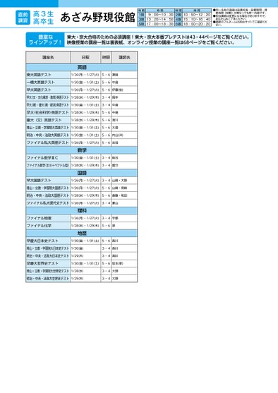 あざみ野現役館講座名日程時限講師名英語東大英語テスト一橋大英語テスト早大英語テスト1/26(月)・1/27(火)5・6瀬﨑1/30(金)・1/31(土)5・6中島1/26(月)・1/27(火)5・6伊藤(宏)早大(文・文化構想・教育)英語テスト1/28(水)・1/29(木)3・4岡本早大(商)・慶大(商・経済)英語テスト1/30(金)・1/31(土)3・4中島早大(社会科学)英語テスト1/28(水)・1/29(木)5・6中島慶大(文)英語テスト1/28(水)・1/29(木)5・6清川青山・立教・学習院大英語テスト1/30(金)・1/31(土)5・6大島明治・中央・法政大英語テスト1/30(金)・1/31(土)5・6内山(洋)ファイナル私大英語テスト1/26(月)・1/27(火)5・6吉田数学ファイナル数学ⅢC1/30(金)・1/31(土)3・4板谷ファイナル数学(ⅡB+ベクトル型)1/28(水)・1/29(木)3・4國分国語早大国語テスト1/26(月)・1/27(火)3・4山崎・大野青山・立教・学習院大国語テスト1/26(月)・1/27(火)5・6山崎・宮崎明治・中央・法政大国語テスト1/28(水)・1/29(木)5・6斎藤・和田ファイナル私大現代文テスト1/26(月)・1/27(火)3・4菱山理科ファイナル物理ファイナル化学1/26(月)・1/27(火)3・4宇都1/28(水)・1/29(木)5・6原地歴早慶大日本史テスト1/30(金)・1/31(土)5・6西川青山・立教・学習院大日本史テスト1/30(金)明治・中央・法政大日本史テスト1/29(木)3・4西川3・4高杉早慶大世界史テスト1/30(金)・1/31(土)5・6坂本(新)青山・立教・学習院大世界史テスト1/28(水)明治・中央・法政大世界史テスト1/29(木)3・4大野3・4大野