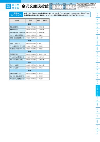 本郷麹町新宿池袋秋葉原自由が丘吉祥寺調布立川町田厚木藤沢横浜あざみ野金沢文庫大宮南浦和川越柏津田沼千葉水戸金沢文庫現役館講座名日程時限講師名英語横国大英語テスト早大英語テスト1/30(金)・1/31(土)3・4伊藤(宏)1/30(金)・1/31(土)5・6田村(修)明治・中央・法政大英語テスト1/30(金)・1/31(土)3・4田村(修)ファイナル私大英語テスト1/28(水)・1/29(木)5・6鏑木英文法・語法完全攻略テスト1/26(月)・1/27(火)5・6水野数学ファイナル数学ⅢC1/26(月)・1/27(火)3・4堺ファイナル数学(ⅡB+ベクトル型)1/30(金)・1/31(土)5・6福島数学必勝チェック(ⅡB+ベクトル型)1/28(水)・1/29(木)3・4富田国語早大国語テスト1/28(水)・1/29(木)3・4小池・太田ファイナル私大現代文テスト1/26(月)・1/27(火)5・6鹿子島ファイナル私大古文テスト1/30(金)・1/31(土)5・6阿部(順)理科ファイナル物理ファイナル化学1/26(月)・1/27(火)5・6井上(順)1/28(水)・1/29(木)3・4早川地歴早慶大日本史テスト1/28(水)・1/29(木)5・6安部明治・中央・法政大日本史テスト1/28(水)3・4安部ファイナル私大世界史テスト1/26(月)・1/27(火)3・4大野