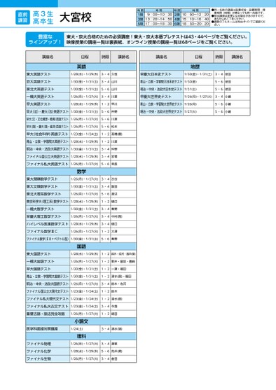 大宮校講座名日程時限講師名講座名日程時限講師名地歴早慶大日本史テスト1/30(金)・1/31(土)3・4依田青山・立教・学習院大日本史テスト1/30(金)明治・中央・法政大日本史テスト1/31(土)5・6依田5・6依田早慶大世界史テスト1/26(月)・1/27(火)3・4小嶋青山・立教・学習院大世界史テスト1/26(月)明治・中央・法政大世界史テスト1/27(火)5・6小嶋5・6小嶋東大英語テスト京大英語テスト東北大英語テスト一橋大英語テスト早大英語テスト英語1/28(水)・1/29(木)3・4久恒1/30(金)・1/31(土)3・4山川1/30(金)・1/31(土)5・6山川1/26(月)・1/27(火)3・4川原1/28(水)・1/29(木)1・2早川早大(法)・慶大(法)英語テスト1/30(金)・1/31(土)5・6仲野早大(文・文化構想・教育)英語テスト1/26(月)・1/27(火)5・6川原早大(商)・慶大(商・経済)英語テスト1/26(月)・1/27(火)5・6松本早大(社会科学)英語テスト1/23(金)・1/24(土)1・2髙橋(慶)青山・立教・学習院大英語テスト1/28(水)・1/29(木)1・2川原明治・中央・法政大英語テスト1/30(金)・1/31(土)3・4仲野ファイナル国公立大英語テスト1/28(水)・1/29(木)3・4岩間ファイナル私大英語テスト1/26(月)・1/27(火)5・6幸長数学東大理類数学テスト東大文類数学テスト1/26(月)・1/27(火)3・4渋谷1/30(金)・1/31(土)3・4飯田東北大理系数学テスト1/26(月)・1/27(火)5・6渡辺東京科学大(理工系)数学テスト1/28(水)・1/29(木)1・2口一橋大数学テスト1/30(金)・1/31(土)3・4秦野早慶大理工数学テスト1/26(月)・1/27(火)3・4中村(隆)ハイレベル医進数学テスト1/28(水)・1/29(木)3・4口ファイナル数学ⅢC1/26(月)・1/27(火)1・2大澤ファイナル数学(ⅡB+ベクトル型)1/30(金)・1/31(土)5・6秦野国語東大国語テスト一橋大国語テスト早大国語テスト1/28(水)・1/29(木)1・2鈴木・佐河・酒井(辰)1/26(月)・1/27(火)1・2新井・脇坂・豊崎1/30(金)・1/31(土)1・2一瀬・福田青山・立教・学習院大国語テスト1/30(金)・1/31(土)1・2清水(直)・福田明治・中央・法政大国語テスト1/26(月)・1/27(火)3・4鈴木・佐河ファイナル国公立大現代文テスト1/23(金)・1/24(土)1・2鈴木ファイナル私大現代文テスト1/23(金)・1/24(土)1・2清水(直)ファイナル私大古文テスト1/23(金)・1/24(土)3・4今西重要古語・語法完全攻略1/26(月)・1/27(火)1・2福田医学科面接対策講座1/24(土)3・4清水(瑞)小論文ファイナル物理ファイナル化学ファイナル生物理科1/26(月)・1/27(火)3・4渡部1/28(水)・1/29(木)5・6向井(勇)1/26(月)・1/27(火)3・4倉田