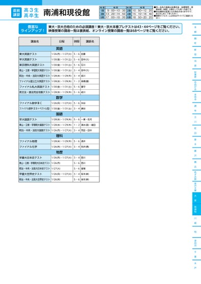 本郷麹町新宿池袋秋葉原自由が丘吉祥寺調布立川町田厚木藤沢横浜あざみ野金沢文庫大宮南浦和川越柏津田沼千葉水戸南浦和現役館講座名日程時限講師名英語東大英語テスト早大英語テスト1/26(月)・1/27(火)5・6加藤1/30(金)・1/31(土)5・6田中(久)東京理科大英語テスト1/30(金)・1/31(土)5・6石川青山・立教・学習院大英語テスト1/30(金)・1/31(土)3・4田中(久)明治・中央・法政大英語テスト1/28(水)・1/29(木)3・4成川ファイナル国公立大英語テスト1/28(水)・1/29(木)1・2髙橋(慶)ファイナル私大英語テスト1/30(金)・1/31(土)5・6護守英文法・語法完全攻略テスト1/28(水)・1/29(木)5・6成川数学ファイナル数学ⅢC1/26(月)・1/27(火)5・6刈谷ファイナル数学(ⅡB+ベクトル型)1/30(金)・1/31(土)3・4瀬谷国語早大国語テスト1/28(水)・1/29(木)5・6一瀬・佐河青山・立教・学習院大国語テスト1/28(水)・1/29(木)1・2清水(直)・福田明治・中央・法政大国語テスト1/26(月)・1/27(火)3・4荒田・田中理科ファイナル物理ファイナル化学1/28(水)・1/29(木)5・6酒井1/26(月)・1/27(火)3・4向井(勇)地歴早慶大日本史テスト1/26(月)・1/27(火)3・4西川青山・立教・学習院大日本史テスト1/26(月)明治・中央・法政大日本史テスト1/27(火)5・6西川5・6富増早慶大世界史テスト1/26(月)・1/27(火)3・4坂本(新)明治・中央・法政大世界史テスト1/26(月)5・6坂本(新)