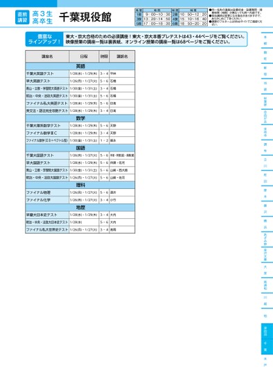 本郷麹町新宿池袋秋葉原自由が丘吉祥寺調布立川町田厚木藤沢横浜あざみ野金沢文庫大宮南浦和川越柏津田沼千葉水戸千葉現役館講座名日程時限講師名英語千葉大英語テスト早大英語テスト1/28(水)・1/29(木)3・4平林1/26(月)・1/27(火)5・6石橋青山・立教・学習院大英語テスト1/30(金)・1/31(土)3・4石橋明治・中央・法政大英語テスト1/30(金)・1/31(土)5・6石橋ファイナル私大英語テスト1/28(水)・1/29(木)5・6日髙英文法・語法完全攻略テスト1/28(水)・1/29(木)3・4日髙数学千葉大理系数学テスト1/28(水)・1/29(木)5・6天野ファイナル数学ⅢC1/28(水)・1/29(木)3・4天野ファイナル数学(ⅡB+ベクトル型)1/30(金)・1/31(土)1・2福永国語千葉大国語テスト早大国語テスト1/26(月)・1/27(火)5・6手塚・阿部(誠)・高橋・阿部(誠)・橋()1/28(水)・1/29(木)5・6兵頭・佐河青山・立教・学習院大国語テスト1/30(金)・1/31(土)5・6山崎・西大路明治・中央・法政大国語テスト1/26(月)・1/27(火)5・6山崎・佐河理科ファイナル物理ファイナル化学1/26(月)・1/27(火)5・6酒井1/26(月)・1/27(火)3・4小竹地歴早慶大日本史テスト1/28(水)・1/29(木)3・4大内明治・中央・法政大日本史テスト1/28(水)5・6大内ファイナル私大世界史テスト1/26(月)・1/27(火)3・4髙岡