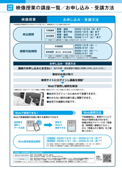 冬期講習映像授業の講座一覧/お申し込み・受講方法映像授業お申し込み・受講方法*対象講座は時間割冊子またはWebサイトをご覧ください。映像授業はオンライン授業とは異なります。申込期間冬期講習直前講習新規・追加2025/12/24(水)まで変更・取りやめ2025/12/5(金)まで新規・追加2026/2/10(火)まで変更・取りやめ2026/1/17(土)※1まで※1「共通テスト本番突破テスト講座」は2025/12/21(日)まで視聴可能期間直前講習(高3生・高卒生対象)冬期講習2025/12/9(火)〜2026/3/31(火)2026/1/21(水)※2〜2026/3/31(火)※2「共通テスト本番突破テスト講座」は2025/12/25(木)から視聴開始「東大本番プレテスト」「京大本番プレテスト」は2026/2/3(火)から視聴開始講座のお申し込みとお支払い他の冬期・直前講習の講座と同様にお申し込みください。お申し込み・受講方法教材のお受け取り専用サイトにログインし講義を視聴※Webで質問し疑問を解消※視聴方法は、申込マイページの「受講証(時間割)ー講習はこちらー」から「受講上のご案内」などをご確認ください。●自分のスケジュールにあわせて受講できます。●わからない部分は繰り返し視聴できます。●自宅での視聴も可能です。Webで質問できる!Webで映像授業の内容に関する質問ができます。質問書を撮影しデータ送信カシャ!回答がWebで確認できるWeb質問方法下記期間内に、専用サイトにてWebで質問を受け付けます。詳細は申込マイページの「受講証(時間割)ー講習はこちらー」から「受講上のご案内」をご確認ください。Web質問書提出期間2025/12/9(火)〜2026/2/16(月)※32026/1/21(水)〜2026/2/16(月)※4冬期講習直前講習※3高3生・高卒生の「共通テスト対策講座」に関する質問は、1/5(月)12:00まで。※4「共通テスト本番突破テスト講座」に関する質問の受付は行いません。対応端末・動作推奨環境(2025年8月現在)タブレット/スマートフォン【OS:iOS16以降】ブラウザ:Safari【OS:Android11以降】ブラウザ:GoogleChrome【OS:Windows10以上】ブラウザ:GoogleChromeの最新バージョン、MicrosoftEdgeの最新バージョン【OS:MacOSⅩ11.0以降】ブラウザ:Safari最新バージョン、GoogleChromeの最新バージョン※OSの将来バージョン、タブレット/スマートフォンの新機種などの対応は、動作確認が完了次第、推奨環境としてご案内していきます。パソコン受講の流れはこちら▶