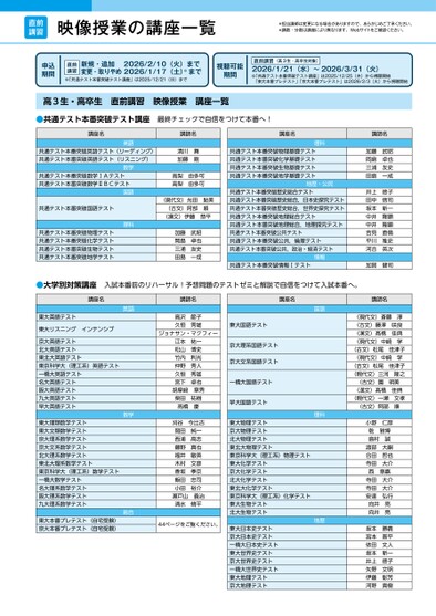 直前講習映像授業の講座一覧*担当講師は変更になる場合がありますので、あらかじめご了承ください。*講数・分数は講座により異なります。Webサイトをご確認ください。申込期間新規・追加2026/2/10(火)まで変更・取りやめ2026/1/17(土)※まで直前講習※「共通テスト本番突破テスト講座」は2025/12/21(日)まで視聴可能期間直前講習(高3生・高卒生対象)2026/1/21(水)〜2026/3/31(火)※「共通テスト本番突破テスト講座」は2025/12/25(木)から視聴開始「東大本番プレテスト」「京大本番プレテスト」は2026/2/3(火)から視聴開始高3生・高卒生直前講習映像授業講座一覧●共通テスト本番突破テスト講座最終チェックで自信をつけて本番へ!講座名共通テスト本番突破英語テスト(リーディング)共通テスト本番突破英語テスト(リスニング)共通テスト本番突破数学ⅠAテスト共通テスト本番突破数学ⅡBCテスト英語数学国語共通テスト本番突破国語テスト共通テスト本番突破物理テスト共通テスト本番突破化学テスト共通テスト本番突破生物テスト共通テスト本番突破地学テスト理科講師名清川舞加藤剛高梨由多可高梨由多可(現代文)光田鮎美(古文)阿部順(漢文)伊藤恭平加藤武昭岡島卓也三浦友史田島一成講座名理科共通テスト本番突破物理基礎テスト共通テスト本番突破化学基礎テスト共通テスト本番突破生物基礎テスト共通テスト本番突破地学基礎テスト地歴・公民共通テスト本番突破歴史総合テスト共通テスト本番突破歴史総合,日本史探究テスト共通テスト本番突破歴史総合,世界史探究テスト共通テスト本番突破地理総合テスト共通テスト本番突破地理総合,地理探究テスト共通テスト本番突破公共テスト共通テスト本番突破公共,倫理テスト共通テスト本番突破公共,政治・経済テスト共通テスト本番突破情報Ⅰテスト情報●大学別対策講座入試本番前のリハーサル!予想問題のテストゼミと解説で自信をつけて入試本番へ。講師名加藤武昭岡島卓也三浦友史田島一成井上徳子田中信司坂本新一中井隆顕中井隆顕吉見直倫平川唯史河合英次加賀健司講師名(現代文)斎藤淳(古文)藤澤咲良(漢文)髙橋佳典(現代文)中崎学(古文)松尾佳津子(現代文)中崎学(古文)松尾佳津子(現代文)三河隆之(古文)園明美(漢文)髙橋佳典(現代文)一瀬文孝(古文)阿部順小野仁彦乾雅博島村誠渡部大嗣合田哲也寺田大介西章嘉寺田大介寺田大介安達弘行向井亮向井亮坂本勝義宮本晋平依田文人坂本新一井上徳子矢野文明伊藤彰芳河野貴樹講座名英語東大英語テスト東大リスニングインテンシブ京大英語テスト北大英語テスト東北大英語テスト東京科学大(理工系)英語テスト一橋大英語テスト名大英語テスト阪大英語テスト九大英語テスト早大英語テスト東大理類数学テスト東大文類数学テスト京大理系数学テスト京大文系数学テスト北大理系数学テスト東北大理系数学テスト東京科学大(理工系)数学テスト一橋大数学テスト名大理系数学テスト阪大理系数学テスト九大理系数学テスト東大本番プレテスト(自宅受験)京大本番プレテスト(自宅受験)数学総合ジョナサン・マクフィー講師名高沢節子久恒秀雄江本祐一松山博史竹内利光仲野秀人久恒秀雄宮下卓也胡摩﨑章秀柴田祐樹髙橋慶刈谷今比古岡田純一西浦高志藤野真也福井敏英木村文彦香坂季京飯田忠司小田裕介瀬戸山義治清水脩平44ページをご覧ください。講座名国語東大国語テスト京大理系国語テスト京大文系国語テスト一橋大国語テスト早大国語テスト理科地歴東大物理テスト京大物理テスト北大物理テスト東北大物理テスト東京科学大(理工系)物理テスト東大化学テスト京大化学テスト北大化学テスト東北大化学テスト東京科学大(理工系)化学テスト東大生物テスト北大生物テスト東大日本史テスト京大日本史テスト一橋大日本史テスト東大世界史テスト京大世界史テスト一橋大世界史テスト東大地理テスト京大地理テスト
