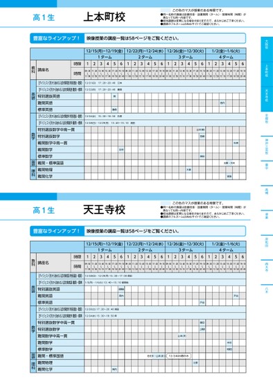 大阪校上本町校天王寺校京都校神戸三宮校豊中高槻堺東岸和田西大寺八木12/15(月)~12/19(金)12/22(月)~12/24(水)12/26(金)~12/30(火)1/2(金)~1/6(火)1ターム2ターム3ターム4ターム12345612345612345612345609:30〜11:0011:20〜12:5013:40〜15:1015:30〜17:0017:20〜18:5019:10〜20:4009:30〜11:0011:20〜12:5013:40〜15:1015:30〜17:0017:20〜18:5019:10〜20:4009:30〜11:0011:20〜12:5013:40〜15:1015:30〜17:0017:20〜18:5019:10〜20:4009:30〜11:0011:20〜12:5013:40〜15:1015:30〜17:0017:20〜18:5019:10〜20:40時限時間講座名12/21(日)17:20〜20:40江本12/22(月)17:20〜20:40藤森慎藤森12/24(水)15:30〜18:50杉原12/28(日)・12/29(月)13:40〜15:10湘田北村【ダイジェスト】冬から始める入試対策英語(特別選抜・難関)【ダイジェスト】冬から始める入試対策英語(難関・標準)特別選抜英語難関英語標準英語【ダイジェスト】冬から始める入試対策数学(特別選抜・難関)【ダイジェスト】冬から始める入試対策数学(難関・標準)特別選抜数学中高一貫特別選抜数学難関数学中高一貫難関数学標準数学難関・標準国語難関物理難関化学西内杉原北野・大村宮路山本(敏)宮崎湘田大學教科英語数学国語理科上本町校豊富なラインアップ!映像授業の講座一覧は58ページをご覧ください。高1生天王寺校この色のマスが授業のある時限です。●同一名称の講座は設置校舎・設置期間(ターム)・授業時間(時限)が異なっても同一内容です。●担当講師は変更になる場合がありますので、あらかじめご了承ください。●講師のフルネームはWebサイトでご確認ください。12/15(月)~12/19(金)12/22(月)~12/24(水)12/26(金)~12/30(火)1/2(金)~1/6(火)1ターム2ターム3ターム4ターム12345612345612345612345609:3011:2013:4015:3017:2019:1009:3011:2013:4015:3017:2019:1009:3011:2013:4015:3017:2019:1009:3011:2013:4015:3017:2019:1011:0012:5015:1017:0018:5020:4011:0012:5015:1017:0018:5020:4011:0012:5015:1017:0018:5020:4011:0012:5015:1017:0018:5020:4012/28(日)・12/29(月)15:30〜17:00原田1/5(月)・1/6(火)13:40〜15:10胡摩﨑胡摩﨑西内12/20(土)17:20〜20:40湘田12/24(水)15:30〜18:50岸戸谷藤田上高原山本(洋)戸谷木村河原田佐佐木・山本(ま)12/24は6限のみ辻居岡内講座名時限時間【ダイジェスト】冬から始める入試対策英語(特別選抜・難関)【ダイジェスト】冬から始める入試対策英語(難関・標準)特別選抜英語難関英語標準英語【ダイジェスト】冬から始める入試対策数学(特別選抜・難関)【ダイジェスト】冬から始める入試対策数学(難関・標準)特別選抜数学中高一貫特別選抜数学難関数学中高一貫難関数学標準数学難関・標準国語難関物理難関化学教科英語数学国語理科豊富なラインアップ!映像授業の講座一覧は58ページをご覧ください。●2025年度/冬期講習/近畿/上本町/高1生/パターン14452025_57_5_513_31_20250717092043.csv/1ページ校了時削除