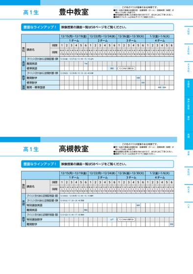 大阪校上本町校天王寺校京都校神戸三宮校豊中高槻堺東岸和田西大寺八木12/15(月)~12/19(金)12/22(月)~12/24(水)12/26(金)~12/30(火)1/2(金)~1/6(火)1ターム2ターム3ターム4ターム12345612345612345612345609:3011:2013:4015:3017:2019:1009:3011:2013:4015:3017:2019:1009:3011:2013:4015:3017:2019:1009:3011:2013:4015:3017:2019:1011:0012:5015:1017:0018:5020:4011:0012:5015:1017:0018:5020:4011:0012:5015:1017:0018:5020:4011:0012:5015:1017:0018:5020:4012/26(金)・12/27(土)13:40〜15:10山内下村12/28(日)・12/29(月)19:10〜20:40杉原西田12/24は5限のみ杉原吉田畑中・松村講座名時限時間【ダイジェスト】冬から始める入試対策英語(難関・標準)難関英語標準英語【ダイジェスト】冬から始める入試対策数学(難関・標準)難関数学標準数学難関・標準国語教科英語数学国語豊富なラインアップ!映像授業の講座一覧は58ページをご覧ください。豊中教室高1生高槻教室この色のマスが授業のある時限です。●同一名称の講座は設置校舎・設置期間(ターム)・授業時間(時限)が異なっても同一内容です。●担当講師は変更になる場合がありますので、あらかじめご了承ください。●講師のフルネームはWebサイトでご確認ください。12/15(月)~12/19(金)12/22(月)~12/24(水)12/26(金)~12/30(火)1/2(金)~1/6(火)1ターム2ターム3ターム4ターム12345612345612345612345609:3011:2013:4015:3017:2019:1009:3011:2013:4015:3017:2019:1009:3011:2013:4015:3017:2019:1009:3011:2013:4015:3017:2019:1011:0012:5015:1017:0018:5020:4011:0012:5015:1017:0018:5020:4011:0012:5015:1017:0018:5020:4011:0012:5015:1017:0018:5020:4012/28(日)・12/29(月)13:40〜15:10横井12/20(土)17:20〜20:40西田西田12/21(日)13:40〜17:00駒井松井山下12/24は6限のみ吉田講座名時限時間【ダイジェスト】冬から始める入試対策英語(特別選抜・難関)【ダイジェスト】冬から始める入試対策英語(難関・標準)特別選抜英語難関英語【ダイジェスト】冬から始める入試対策数学(特別選抜・難関)特別選抜数学難関数学教科英語数学豊富なラインアップ!映像授業の講座一覧は58ページをご覧ください。