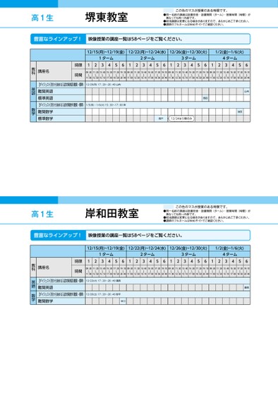 12/15(月)~12/19(金)12/22(月)~12/24(水)12/26(金)~12/30(火)1/2(金)~1/6(火)1ターム2ターム3ターム4ターム12345612345612345612345609:3011:2013:4015:3017:2019:1009:3011:2013:4015:3017:2019:1009:3011:2013:4015:3017:2019:1009:3011:2013:4015:3017:2019:1011:0012:5015:1017:0018:5020:4011:0012:5015:1017:0018:5020:4011:0012:5015:1017:0018:5020:4011:0012:5015:1017:0018:5020:4012/29(月)17:20〜20:40山内1/5(月)・1/6(火)15:30〜17:00岸西田山内池田髙戸12/24は5限のみ講座名時限時間【ダイジェスト】冬から始める入試対策英語(難関・標準)難関英語標準英語【ダイジェスト】冬から始める入試対策数学(難関・標準)難関数学標準数学教科英語数学豊富なラインアップ!映像授業の講座一覧は58ページをご覧ください。堺東教室高1生岸和田教室この色のマスが授業のある時限です。●同一名称の講座は設置校舎・設置期間(ターム)・授業時間(時限)が異なっても同一内容です。●担当講師は変更になる場合がありますので、あらかじめご了承ください。●講師のフルネームはWebサイトでご確認ください。12/15(月)~12/19(金)12/22(月)~12/24(水)12/26(金)~12/30(火)1/2(金)~1/6(火)1ターム2ターム3ターム4ターム12345612345612345612345609:30〜11:0011:20〜12:5013:40〜15:1015:30〜17:0017:20〜18:5019:10〜20:4009:30〜11:0011:20〜12:5013:40〜15:1015:30〜17:0017:20〜18:5019:10〜20:4009:30〜11:0011:20〜12:5013:40〜15:1015:30〜17:0017:20〜18:5019:10〜20:4009:30〜11:0011:20〜12:5013:40〜15:1015:30〜17:0017:20〜18:5019:10〜20:40時限時間講座名【ダイジェスト】冬から始める入試対策英語(難関・標準)難関英語【ダイジェスト】冬から始める入試対策数学(難関・標準)難関数学12/23(火)17:20〜20:40藤森12/20(土)17:20〜20:40影平中川藤森教科英語数学豊富なラインアップ!映像授業の講座一覧は58ページをご覧ください。