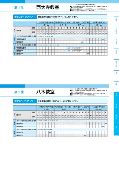 大阪校上本町校天王寺校京都校神戸三宮校豊中高槻堺東岸和田西大寺八木12/15(月)~12/19(金)12/22(月)~12/24(水)12/26(金)~12/30(火)1/2(金)~1/6(火)1ターム2ターム3ターム4ターム12345612345612345612345609:30〜11:0011:20〜12:5013:40〜15:1015:30〜17:0017:20〜18:5019:10〜20:4009:30〜11:0011:20〜12:5013:40〜15:1015:30〜17:0017:20〜18:5019:10〜20:4009:30〜11:0011:20〜12:5013:40〜15:1015:30〜17:0017:20〜18:5019:10〜20:4009:30〜11:0011:20〜12:5013:40〜15:1015:30〜17:0017:20〜18:5019:10〜20:40時限時間講座名12/25(木)17:20〜20:40山内12/18(木)・12/19(金)17:20〜18:50杉原【ダイジェスト】冬から始める入試対策英語(難関・標準)特別選抜英語難関英語【ダイジェスト】冬から始める入試対策数学(難関・標準)特別選抜数学難関数学難関化学増田松井上村河村12/24は5限のみ12/24は5限のみ福井教科英語数学理科豊富なラインアップ!映像授業の講座一覧は58ページをご覧ください。西大寺教室高1生八木教室この色のマスが授業のある時限です。●同一名称の講座は設置校舎・設置期間(ターム)・授業時間(時限)が異なっても同一内容です。●担当講師は変更になる場合がありますので、あらかじめご了承ください。●講師のフルネームはWebサイトでご確認ください。12/15(月)~12/19(金)12/22(月)~12/24(水)12/26(金)~12/30(火)1/2(金)~1/6(火)1ターム2ターム3ターム4ターム12345612345612345612345609:3011:2013:4015:3017:2019:1009:3011:2013:4015:3017:2019:1009:3011:2013:4015:3017:2019:1009:3011:2013:4015:3017:2019:1011:0012:5015:1017:0018:5020:4011:0012:5015:1017:0018:5020:4011:0012:5015:1017:0018:5020:4011:0012:5015:1017:0018:5020:4012/26(金)・12/27(土)19:10〜20:40千代12/24(水)17:20〜20:40池田信岡西田西田髙戸講座名時限時間【ダイジェスト】冬から始める入試対策英語(難関・標準)難関英語標準英語【ダイジェスト】冬から始める入試対策数学(難関・標準)難関数学標準数学教科英語数学豊富なラインアップ!映像授業の講座一覧は58ページをご覧ください。●2025年度/冬期講習/近畿/西大寺/高1生/パターン14452025_57_5_535_31_20250717092043.csv/1ページ校了時削除