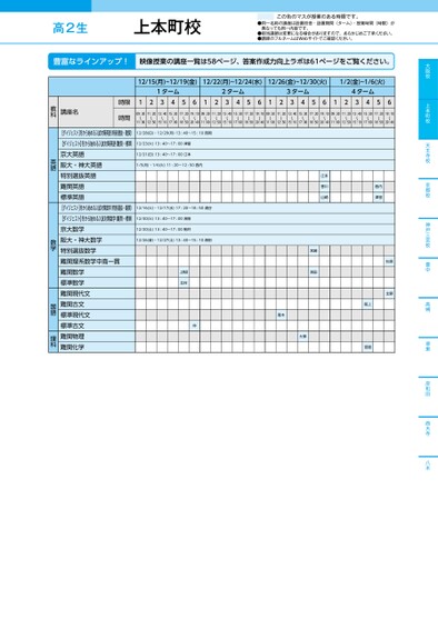 大阪校上本町校天王寺校京都校神戸三宮校豊中高槻堺東岸和田西大寺八木上本町校豊富なラインアップ!映像授業の講座一覧は58ページ、答案作成力向上ラボは61ページをご覧ください。12/15(月)~12/19(金)12/22(月)~12/24(水)12/26(金)~12/30(火)1/2(金)~1/6(火)1ターム2ターム3ターム4ターム12345612345612345612345609:30〜11:0011:20〜12:5013:40〜15:1015:30〜17:0017:20〜18:5019:10〜20:4009:30〜11:0011:20〜12:5013:40〜15:1015:30〜17:0017:20〜18:5019:10〜20:4009:30〜11:0011:20〜12:5013:40〜15:1015:30〜17:0017:20〜18:5019:10〜20:4009:30〜11:0011:20〜12:5013:40〜15:1015:30〜17:0017:20〜18:5019:10〜20:4012/28(日)・12/29(月)13:40〜15:10西岡12/23(火)13:40〜17:00津留12/21(日)13:40〜17:00江本1/5(月)・1/6(火)11:20〜12:50西内12/16(火)・12/17(水)17:20〜18:50涌谷12/30(火)13:40〜17:00湘田12/20(土)13:40〜17:00駒井12/26(金)・12/27(土)13:40〜15:10湘田上高原北村仲江本香川山崎西内津留宮崎湘田青木大學杉原北野阪上宮路時限時間講座名教科【ダイジェスト】冬から始める入試対策英語(特別選抜・難関)【ダイジェスト】冬から始める入試対策英語(難関・標準)京大英語阪大・神大英語特別選抜英語難関英語標準英語【ダイジェスト】冬から始める入試対策数学(特別選抜・難関)【ダイジェスト】冬から始める入試対策数学(難関・標準)京大数学阪大・神大数学特別選抜数学難関理系数学中高一貫難関数学標準数学難関現代文難関古文標準現代文標準古文難関物理難関化学英語数学国語理科●2025年度/冬期講習/近畿/上本町/高2生/パターン14452025_57_5_513_32_20250717092103.csv/1ページ校了時削除
